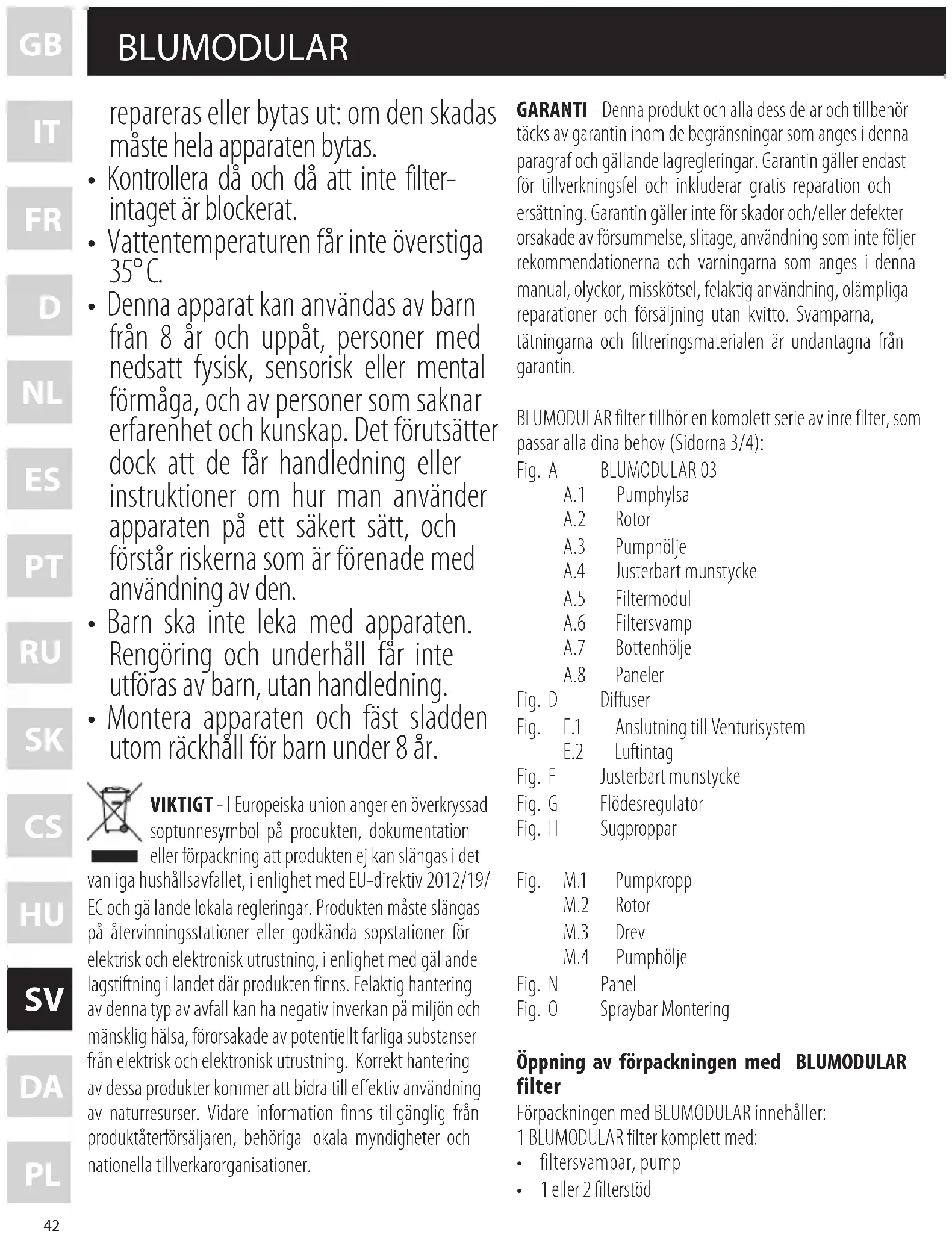 GARANTI - Denna produkt och alla dess delar och tillbehör täcks av garantin inom de begränsningar som anges i denna paragraf och gällande lagregleringar. Garantin gäller endast för tillverkningsfel och inkluderar gratis reparation och ersättning. Garantin gäller inte för skador och/eller defekter orsakade av försummelse, slitage, användning som inte följer rekommendationerna och varningarna som anges i denna manual, olyckor, misskötsel, felaktig användning, olämpliga reparationer och försäljning utan kvitto. Svamparna, tätningarna och filtreringsmaterialen är undantagna från garantin. BLUMODULAR filter tillhör en komplett serie av inre filter, som passar alla dina behov (Sidorna 3/4): Fig. A BLUMODULAR 03 A.1 Pumphylsa A.2 Rotor A.3 Pumphölje A.4 Justerbart munstycke A.5 Filtermodul A.6 Filtersvamp A.7 Bottenhölje A.8 Paneler Fig. D Diffuser Fig. E.1 Anslutning till Venturisystem E.2 Luftintag Fig. F Justerbart munstycke Fig. G Flödesregulator Fig. H Sugproppar Fig. M.1 Pumpkropp M.2 Rotor M.3 Drev M.4 Pumphölje Fig. N Panel Fig. O Spraybar Montering Öppning av förpackningen med BLUMODULAR filter Förpackningen med BLUMODULAR innehåller: 1 BLUMODULAR filter komplett med: