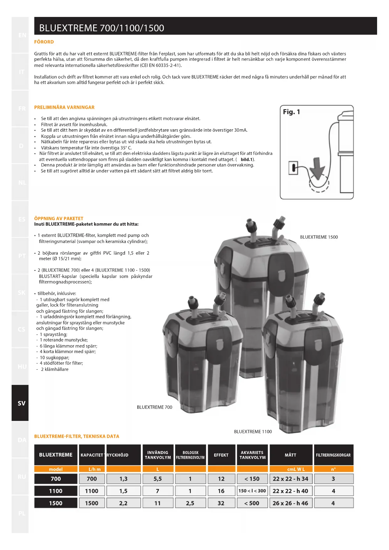 FÖRORD Grattis för att du har valt ett externt BLUEXTREME-filter från Ferplast, som har utformats för att du ska bli helt nöjd och försäkra dina fiskars och växters perfekta hälsa, utan att försumma din säkerhet, då den kraftfulla pumpen integrerad i filtret är helt nersänkbar och varje komponent överensstämmer med relevanta internationella säkerhetsföreskrifter (CEI EN 60335-2-41). Installation och drift av filtret kommer att vara enkel och rolig. Och tack vare BLUEXTREME räcker det med några få minuters underhåll per månad för att ha ett akvarium som alltid fungerar perfekt och är i perfekt skick. Fig. 1