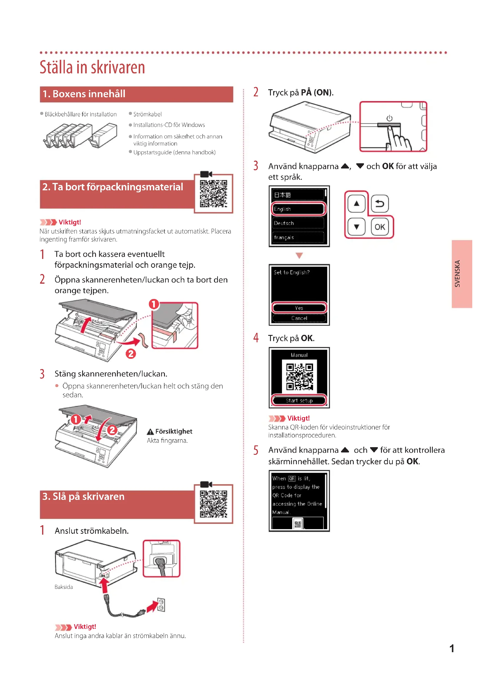Bläckbehållare för installation Strömkabel Installations-CD för Windows Information om säkerhet och annan viktig information Uppstartsguide (denna handbok)