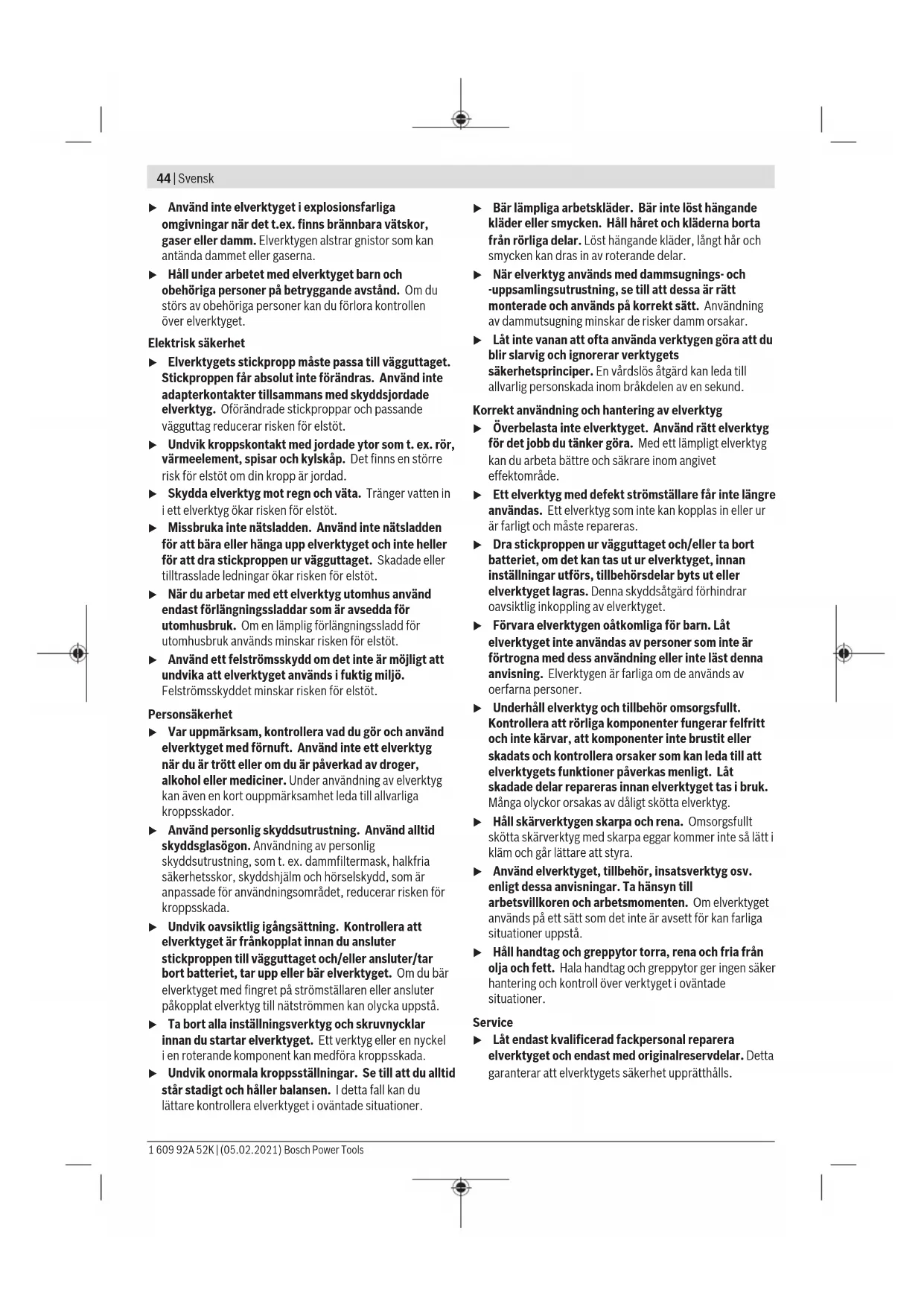 Den vibrationsnivå och det bullervärde som anges i dessa anvisningar har uppmätts enligt en mätmetod som normerats och kan användas för att jämföra elverktyg med varandra. Mätmetoden är även lämplig för preliminär bedömning av vibrations- och bullernivån. Den angivna vibrations- och bullernivån representerar den huvudsakliga användningen av elverktyget. Om däremot elverktyget används för andra ändamål, med andra insatsverktyg eller inte underhållits ordentligt kan vibrations- och bullernivån avvika. Då kan vibrations- och bullernivån under arbetsperioden öka betydligt under hela arbetstiden. För en exakt bedömning av vibrations- och bullernivån bör även de tider beaktas när elverktyget är avstängt eller är igång, men inte används. Detta reducerar vibrations- och bullerbelastningen för den totala arbetsperioden betydligt. Bestäm extra säkerhetsåtgärder för att skydda operatören mot vibrationernas inverkan t.ex.: underhåll av elverktyget och insatsverktygen, att hålla händerna varma, organisation av arbetsförloppen. Montage u Dra stickproppen ur nätuttaget innan arbeten utförs på elverktyget. Sätta in/byta sågblad u Använd skyddshandskar vid montering eller byte av insatsverktyget. Insatsverktyg är vassa och kan bli heta vid längre användning. u Vid byte av sågblad, se till att sågbladsfästet är fritt från materialrester, t.ex. trä- eller metallspån. u Se till att inget avbrutet skaft befinner sig i sågbladsfästet. Välja sågblad En översikt över rekommenderade sågblad hittar du i slutet av denna bruksanvisning. Använd endast sågblad med 1/2"- universalskaft. Sågbladet ska inte vara längre än vad som behövs för avsett snitt. Sågbladets skafttjocklek måste vara0,8–1,8mm. Sågbladets montering (sebildA) Tryck SDS-spaken(9) framåt och för sågbladet (1) bakom klämplattan och in i sågbladsfästet(3). Släpp SDS- spaken(9) igen. u Kontrollera att sågbladet sitter fast genom att dra i det. Ett löst sågblad kan falla ut och orsaka personskada. För vissa arbeten kan sågbladet (1) också vändas i 180° (tänderna uppåt) och sedan sättas i igen. Ta ut sågbladet (sebildB) u Låt sågbladet svalna innan du tar ut det. Vid beröring av det heta sågbladet föreligger risk för skador. Tryck SDS-spaken(9) framåt och dra ut sågbladet(1). Släpp SDS-spaken(9) igen. Damm-/spånutsugning Dammet från material som t.ex. blyhaltig målning, vissa träslag, mineraler och metall kan vara hälsovådligt. Beröring eller inandning av dammet kan orsaka allergiska reaktioner och/eller andningsbesvär hos användaren eller personer som uppehåller sig i närheten. Vissa damm från ek eller bok anses vara cancerogena, speciellt då i förbindelse med tillsatsämnen för träbehandling (kromat, träkonserveringsmedel). Endast yrkesmän får bearbeta asbesthaltigt material. – Se till att arbetsplatsen är väl ventilerad. – Vi rekommenderar ett andningsskydd i filterklass P2. Beakta de föreskrifter som i aktuellt land gäller för bearbetat material. u Undvik dammanhopning på arbetsplatsen. Damm kan lätt självantändas. Drift Driftstart u Beakta nätspänningen! Kontrollera att strömkällans spänning överensstämmer med uppgifterna på elverktygets typskylt. Elverktyg märkta med 230V kan även anslutas till 220V. In- och urkoppling För att slå på elverktyget, tryck på på-/av-knappen (6). För att arretera strömbrytaren (6), håll den intryckt och tryck dessutom på spärrknappen (5). För urkoppling av elverktyget, släpp på-/av-knappen (6). Vid arreterad på-/av-knapp (6) trycker du först på denna och släpper den sedan. Styra antalet slag Du kan reglera det startade elverktygets antal slag medan det är igång, beroende på hur långt du trycker in på-/ avknappen (6). Ett lätt tryck på på-/av-knappen (6) ger ett lågt antal slag. Med tilltagande tryck ökar antalet slag. Lämpligt slagtal beror på material och arbetsförhållande. Prova fram den bästa inställningen genom praktiska försök. En reducering av antalet slag rekommenderas när sågbladet sätts mot arbetsstycket och vid sågning av plast och aluminium. Vid en längre tids arbete med ett lågt slagantal kan elverktyget bli mycket varmt. Ta ut sågbladet och låt verktyget gå med maximalt antal slag i cirka 3 minuter för att svalna. Arbetsanvisningar u Dra stickproppen ur nätuttaget innan arbeten utförs på elverktyget. u Slå ifrån elverktyget om sågbladet blockeras. 1 609 92A 52K | (05.02.2021) Bosch Power ToolsSvensk | 47 Tips u Beakta lagstadgade bestämmelser och rekommendationer från materialtillverkaren vid sågning av lättviktsmaterial. Kontrollera före sågning i trä, spånskivor, byggmaterial mm att alla främmande partiklar som t.ex. spikar, skruvar har avlägsnats och använd lämpligt sågblad. Starta elverktyget och för det mot arbetsstycket som ska bearbetas. Sätt fotplattan(2) på verktygsytan och såga med jämnt anliggningstryck resp. förskjutning genom materialet. Stäng av elverktyget efter arbetet. Om sågbladet fastnar, stäng av elverktyget omedelbart. Sprid sågspalten något med lämpligt verktyg och dra ut elverktyget. Vridbar fotplatta (sebildC) Fotplattan(2) anpassar sig till ytans vinkel tack vare sin rörlighet. Instickssågning (se bildE–F) u Inga mjuka material såsom trä, gipskartong eller liknande får bearbetas med doppsågning! Iarbetsstycken av metall får instickssågning inte ske! Använd bara korta sågblad för doppsågning. Sätt elverktyget mot arbetsstycket med kanten av fotplattan (2) utan att sågbladet (1) berör arbetsstycket, och starta det. Välj maximalt varvtal vid elverktyg med varvtalsstyrning. Tryck elverktyget fast mot arbetsstycket och låt sågbladet långsamt sjunka ner i arbetsstycket. Så snart fotplattan(2) ligger an mot arbetsstycket, såga vidare längs önskad såglinje. För vissa arbeten kan sågbladet(1) också vändas i 180° och sättas in igen, och