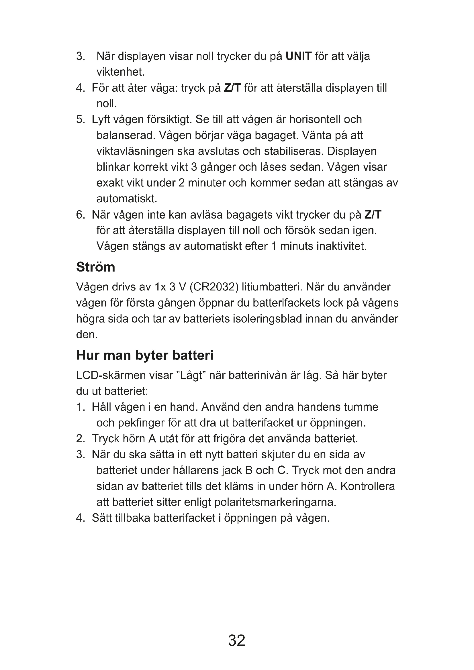 för att återställa displayen till noll och försök sedan igen. Vågen stängs av automatiskt efter 1 minuts inaktivitet. Ström Vågen drivs av 1x 3 V (CR2032) litiumbatteri. När du använder vågen för första gången öppnar du batterifackets lock på vågens högra sida och tar av batteriets isoleringsblad innan du använder den. Hur man byter batteri LCD-skärmen visar ”Lågt” när batterinivån är låg. Så här byter du ut batteriet: