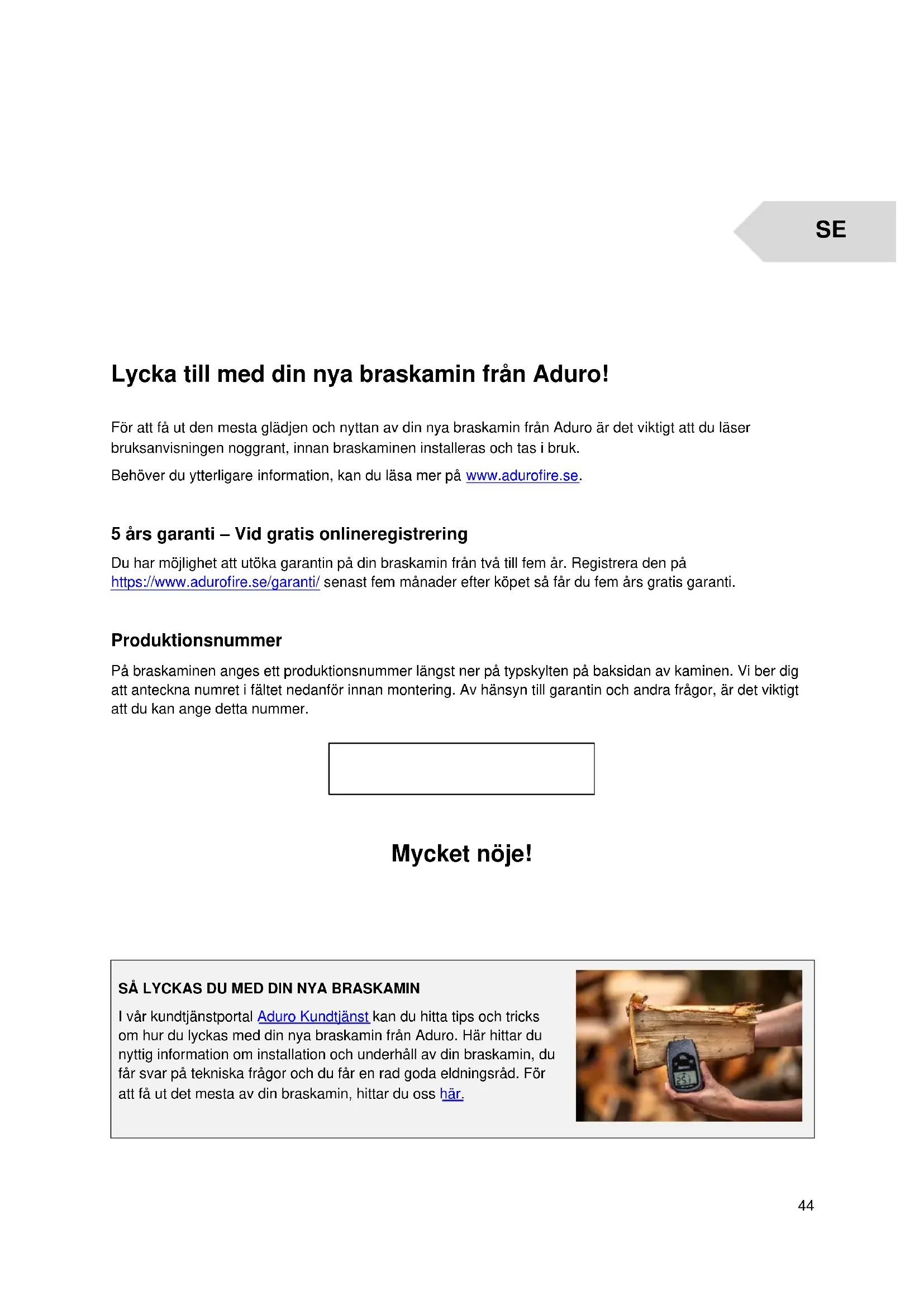 Lycka till med din nya braskamin från Aduro! För att få ut den mesta glädjen och nyttan av din nya braskamin från Aduro är det viktigt att du läser bruksanvisningen noggrant, innan braskaminen installeras och tas i bruk. Behöver du ytterligare information, kan du läsa mer på www.adurofire.se. 5 års garanti – Vid gratis onlineregistrering Du har möjlighet att utöka garantin på din braskamin från två till fem år. Registrera den på https://www.adurofire.se/garanti/ senast fem månader efter köpet så får du fem års gratis garanti. Produktionsnummer På braskaminen anges ett produktionsnummer längst ner på typskylten på baksidan av kaminen. Vi ber dig att anteckna numret i fältet nedanför innan montering. Av hänsyn till garantin och andra frågor, är det viktigt att du kan ange detta nummer.
