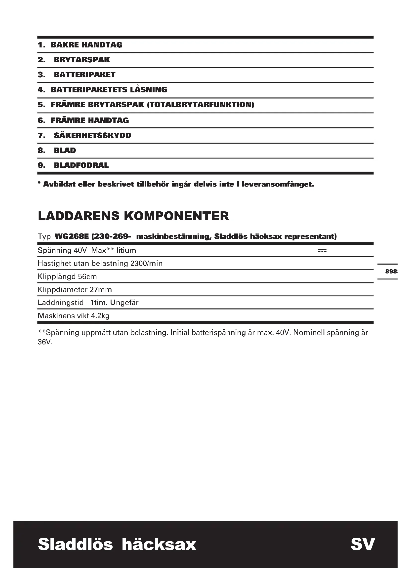 - Avbildat eller beskrivet tillbehör ingår delvis inte I leveransomfånget. LADDARENS KOMPONENTER Typ WG268E (230-269- maskinbestämning, Sladdlös häcksax representant) Spänning 40V Max** litium Hastighet utan belastning 2300/min Klipplängd 56cm Klippdiameter 27mm Laddningstid 1tim. Ungefär Maskinens vikt 4.2kg **Spänning uppmätt utan belastning. Initial batterispänning är max. 40V. Nominell spänning är 36V. Sladdlös häcksax SVSladdlös häcksax SV