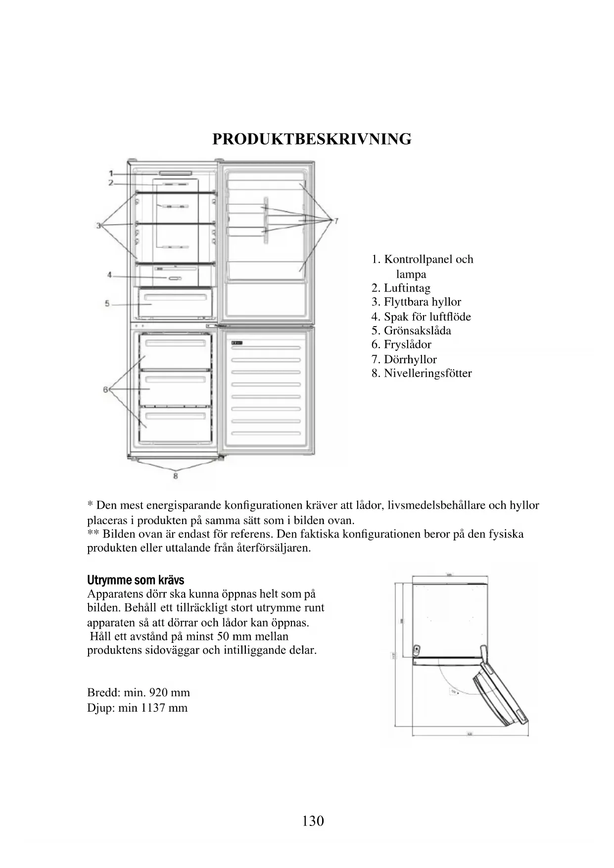 - Den mest energisparande konfigurationen kräver att lådor, livsmedelsbehållare och hyllor placeras i produkten på samma sätt som i bilden ovan. ** Bilden ovan är endast för referens. Den faktiska konfigurationen beror på den fysiska produkten eller uttalande från återförsäljaren. Utrymme som krävs Apparatens dörr ska kunna öppnas helt som på bilden. Behåll ett tillräckligt stort utrymme runt apparaten så att dörrar och lådor kan öppnas. Håll ett avstånd på minst 50 mm mellan produktens sidoväggar och intilliggande delar. Bredd: min. 920 mm Djup: min 1137 mm131 Användning