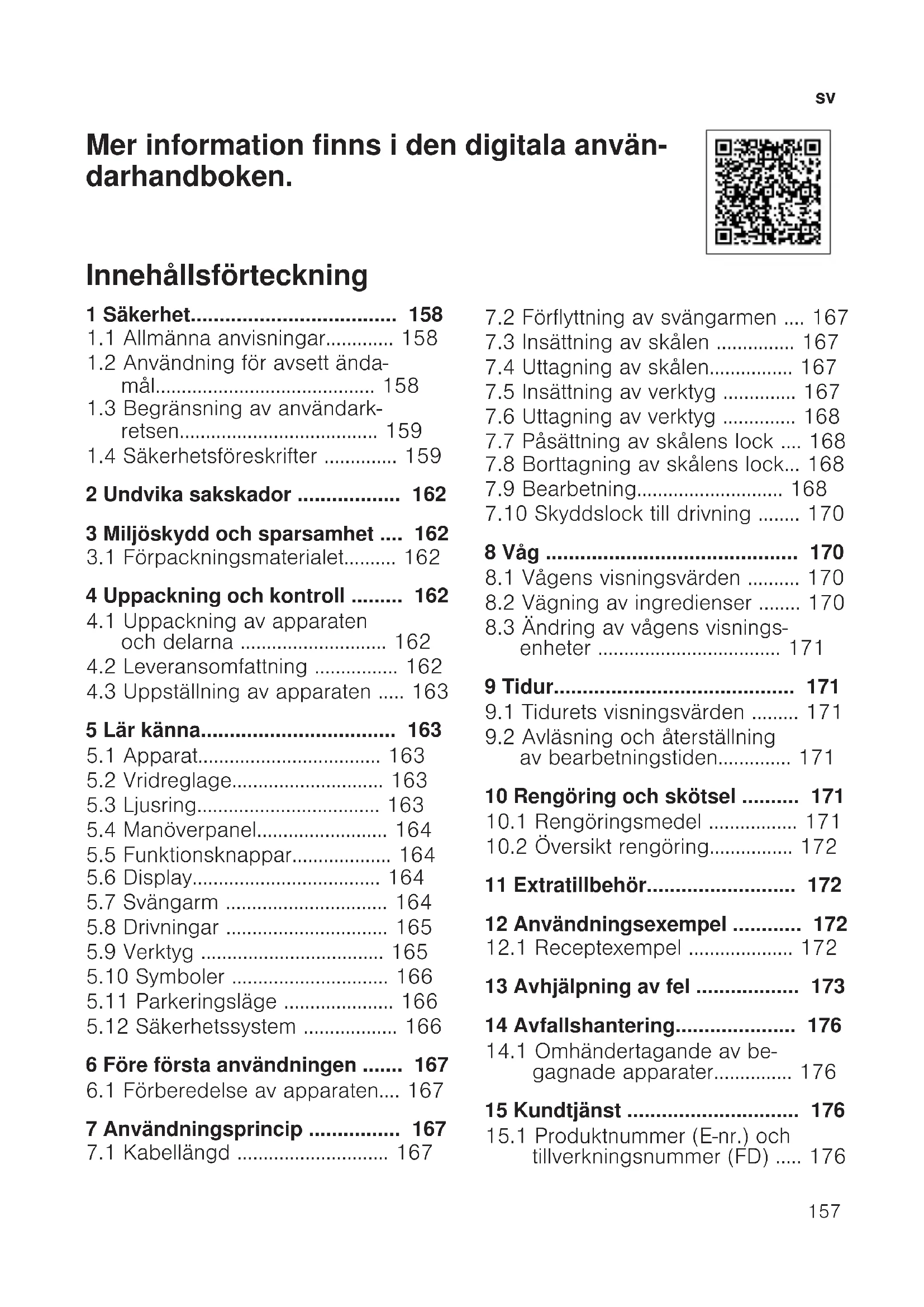 Mer information finns i den digitala använ- darhandboken. Innehållsförteckning 1 Säkerhet....................................158