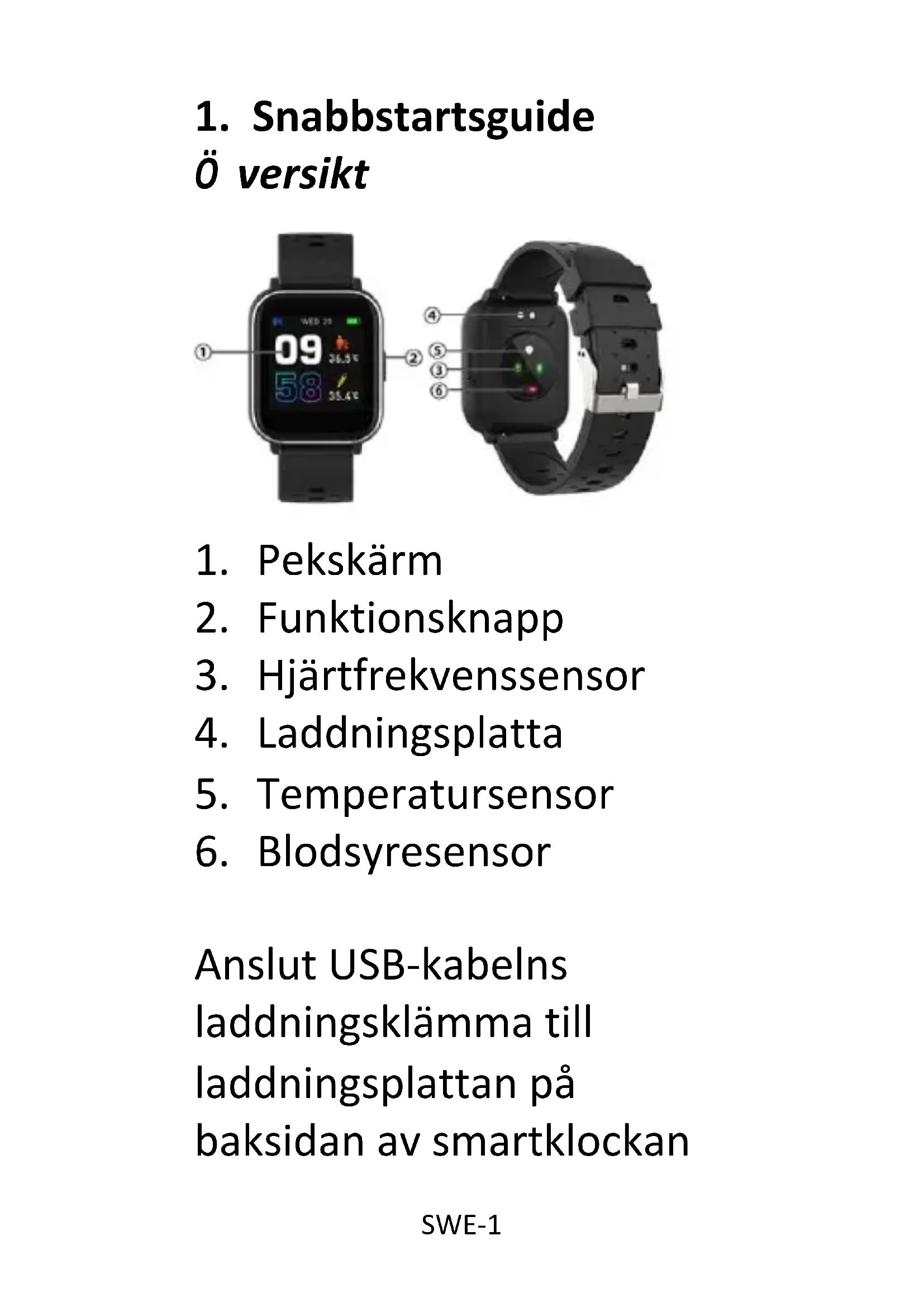 Introduktion till att använda enheten ⚫ Du kan höja handen eller trycka på funktionsknappen för att tända skärmen. ⚫ Tryck och håll klockans skärm nedtryckt och svep sedan åt upp eller ner för att ändra urtalvan.SWE-5 ⚫ Tryck och håll ned funktionsknappen för att slå på smartklockan när den är avstängd. 2.Bruksanvisning ⚫ Slå på: Tryck och håll funktionsknappen nedtryckt i tre sekunder. ⚫ Gå till menyskärmen: Svep vänster på klockans skärm. ⚫ Välj en funktion: Tryck på ikonen. ⚫ Lämna menyn: Svep skärmen från vänster till höger. ⚫ Gå tillbaka till klockans urtavla: Tryck kort påSWE-6 funktionsknappen på valfri skärm. ⚫ Kontrollera meddelanden: Svep från vänster till höger på klockskärmen.