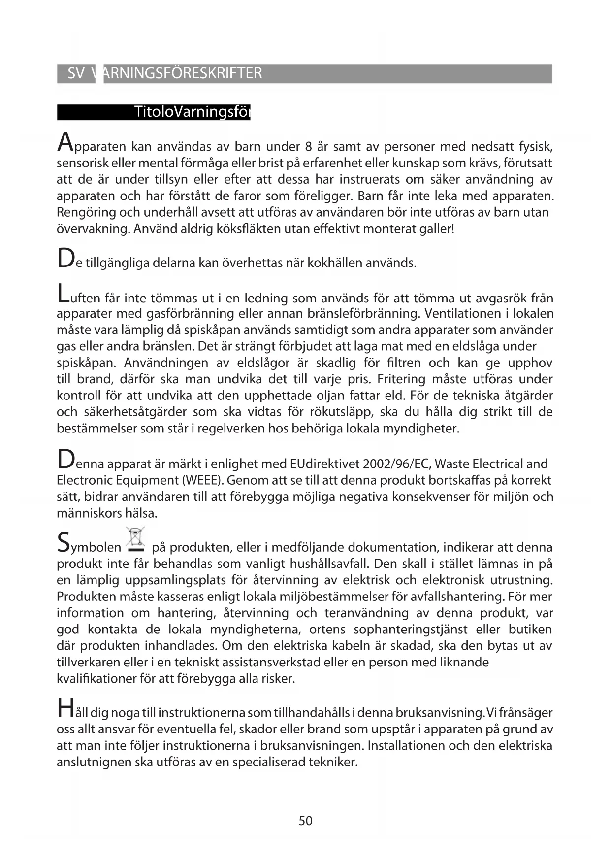 Apparaten kan användas av barn under 8 år samt av personer med nedsatt fysisk, sensorisk eller mental förmåga eller brist på erfarenhet eller kunskap som krävs, förutsatt att de är under tillsyn eller efter att dessa har instruerats om säker användning av apparaten och har förstått de faror som föreligger. Barn får inte leka med apparaten. Rengöring och underhåll avsett att utföras av användaren bör inte utföras av barn utan övervakning. Använd aldrig köksäkten utan eektivt monterat galler! De tillgängliga delarna kan överhettas när kokhällen används. Luften får inte tömmas ut i en ledning som används för att tömma ut avgasrök från apparater med gasförbränning eller annan bränsleförbränning. Ventilationen i lokalen måste vara lämplig då spiskåpan används samtidigt som andra apparater som använder gas eller andra bränslen. Det är strängt förbjudet att laga mat med en eldslåga under spiskåpan. Användningen av eldslågor är skadlig för ltren och kan ge upphov till brand, därför ska man undvika det till varje pris. Fritering måste utföras under kontroll för att undvika att den upphettade oljan fattar eld. För de tekniska åtgärder och säkerhetsåtgärder som ska vidtas för rökutsläpp, ska du hålla dig strikt till de bestämmelser som står i regelverken hos behöriga lokala myndigheter. Denna apparat är märkt i enlighet med EUdirektivet 2002/96/EC, Waste Electrical and Electronic Equipment (WEEE). Genom att se till att denna produkt bortskaas på korrekt sätt, bidrar användaren till att förebygga möjliga negativa konsekvenser för miljön och människors hälsa. Symbolen på produkten, eller i medföljande dokumentation, indikerar att denna produkt inte får behandlas som vanligt hushållsavfall. Den skall i stället lämnas in på en lämplig uppsamlingsplats för återvinning av elektrisk och elektronisk utrustning. Produkten måste kasseras enligt lokala miljöbestämmelser för avfallshantering. För mer information om hantering, återvinning och teranvändning av denna produkt, var god kontakta de lokala myndigheterna, ortens sophanteringstjänst eller butiken där produkten inhandlades. Om den elektriska kabeln är skadad, ska den bytas ut av tillverkaren eller i en tekniskt assistansverkstad eller en person med liknande kvalikationer för att förebygga alla risker. Håll dig noga till instruktionerna som tillhandahålls i denna bruksanvisning. Vi frånsäger oss allt ansvar för eventuella fel, skador eller brand som upsptår i apparaten på grund av att man inte följer instruktionerna i bruksanvisningen. Installationen och den elektriska anslutnignen ska utföras av en specialiserad tekniker.AVVERTENZE