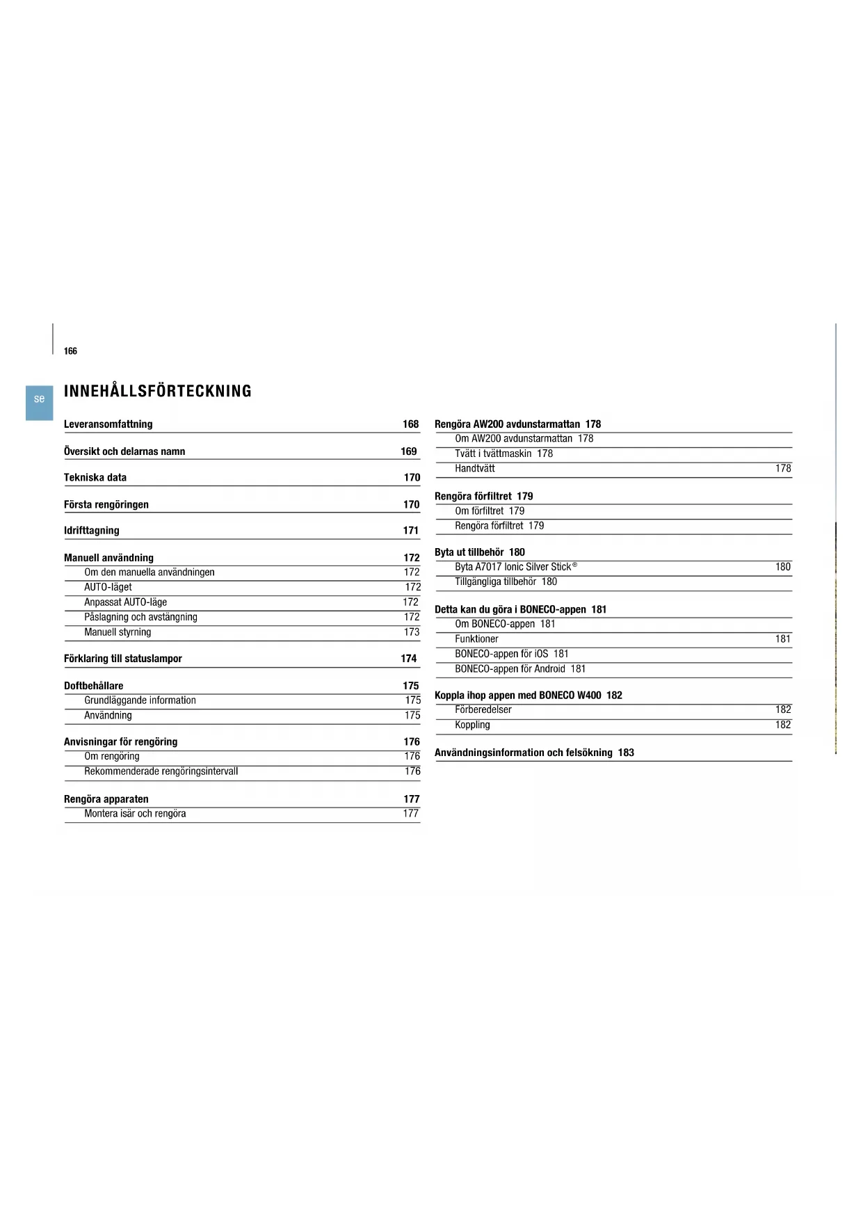 Tillgängliga tillbehör 180 Detta kan du göra i BONECO-appen 181 Om BONECO-appen 181 Funktioner 181 BONECO-appen för iOS 181 BONECO-appen för Android 181 Koppla ihop appen med BONECO W400 182 Förberedelser 182 Koppling 182 Användningsinformation och felsökning 183 Leveransomfattning 168 Översikt och delarnas namn 169 Tekniska data 170 Första rengöringen 170 Idrifttagning 171 Manuell användning 172 Om den manuella användningen 172 AUTO-läget 172 Anpassat AUTO-läge 172 Påslagning och avstängning 172 Manuell styrning 173 Förklaring till statuslampor 174 Doftbehållare 175 Grundläggande information 175 Användning 175 Anvisningar för rengöring 176 Om rengöring 176 Rekommenderade rengöringsintervall 176 Rengöra apparaten 177 Montera isär och rengöra 177