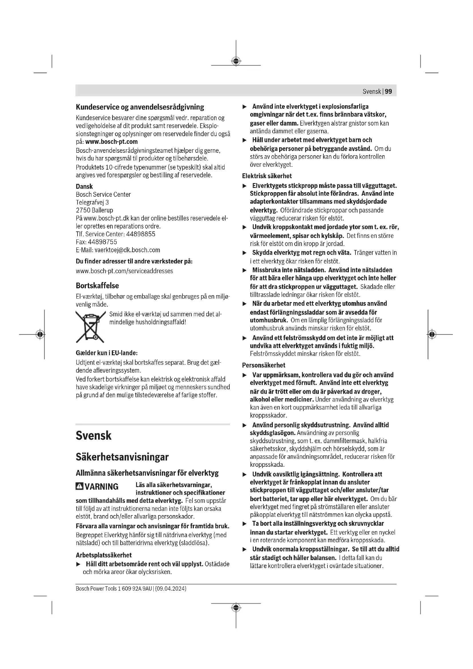 Kontaktudførelse med lås For at tænde el-værktøjet skal du først trykke på tænd/sluk- knappen(3) ➊ og derefter skubbe den fremad ➋. Tryk der- efter på den, og hold den inde ➌. For at låse den nedtrykkede tænd/sluk-knap(3) skal du skubbe tænd/sluk-knappen(3) videre frem ➍. For at slukke el-værktøjet skal du slippe tænd/sluk- knappen(3) eller, hvis den er låst, trykke kort på tænd/sluk- knappen(3) og slippe den igen. Knapmodel uden låsefunktion For at tænde el-værktøjet skal du først trykke på tænd/sluk- knappen(3) ➊ og derefter skubbe den fremad ➋. Tryk der- efter på den, og hold den inde ➌. El‑værktøjet slukkes ved at slippe tænd/sluk-kontakten(3) igen. u Kontrollér slibeværktøjet før brug. Slibeværktøjet skal være monteret sikkert, så det kan dreje frit. Fore- tag en prøvekørsel i mindst 1 minut uden belastning. Brug ikke beskadigede, ikke-runde eller vibrerende slibeværktøjer. Beskadigede slibeværktøjer kan gå i stykker og forårsage skader. Vedligeholdelse og service Vedligeholdelse og rengøring u Træk stikket ud af stikkontakten, før der udføres ar- bejde på el‑værktøjet. u El‑værktøj og el‑værktøjets ventilationsåbninger skal altid holdes rene for at sikre et godt og sikkert ar- bejde. u Brug så vidt muligt altid et udsugningsanlæg ved ek- streme anvendelsesforhold. Blæs ventilationsåbnin- gerne igennem med hyppige mellemrum, og forkobl en fejlstrømsafbryder (PRCD). Ved bearbejdning af me- tal kan ledende støv aflejre sig inde i elværktøjet. Elværk- tøjets beskyttelsesisolering kan forringes. Opbevar og behandle tilbehøret omhyggeligt. Hvis det er nødvendigt at erstatte tilslutningsledningen, skal dette arbejde udføres af Bosch eller på et autoriseret servi- ceværksted for Bosch el‑værktøj for at undgå farer. 1 609 92A 9AU | (09.04.2024) Bosch Power ToolsSvensk | 99 Kundeservice og anvendelsesrådgivning Kundeservice besvarer dine spørgsmål vedr. reparation og vedligeholdelse af dit produkt samt reservedele. Eksplo- sionstegninger og oplysninger om reservedele finder du også på: www.bosch-pt.com Bosch-anvendelsesrådgivningsteamet hjælper dig gerne, hvis du har spørgsmål til produkter og tilbehørsdele. Produktets 10‑cifrede typenummer (se typeskilt) skal altid angives ved forespørgsler og bestilling af reservedele. Dansk Bosch Service Center Telegrafvej 3 2750 Ballerup På www.bosch-pt.dk kan der online bestilles reservedele el- ler oprettes en reparations ordre. Tlf. Service Center: 44898855 Fax: 44898755 E-Mail: vaerktoej@dk.bosch.com Du finder adresser til andre værksteder på: www.bosch-pt.com/serviceaddresses Bortskaffelse El‑værktøj, tilbehør og emballage skal genbruges på en miljø- venlig måde. Smid ikke el-værktøj ud sammen med det al- mindelige husholdningsaffald! Gælder kun i EU‑lande: Udtjent el-værktøj skal bortskaffes separat. Brug det gæl- dende afleveringssystem. Ved forkert bortskaffelse kan elektrisk og elektronisk affald have skadelige virkninger på miljøet og menneskers sundhed på grund af den mulige tilstedeværelse af farlige stoffer. Svensk Säkerhetsanvisningar Allmänna säkerhetsanvisningar för elverktyg VARNING Läs alla säkerhetsvarningar, instruktioner och specifikationer som tillhandahålls med detta elverktyg. Fel som uppstår till följd av att instruktionerna nedan inte följts kan orsaka elstöt, brand och/eller allvarliga personskador. Förvara alla varningar och anvisningar för framtida bruk. Begreppet Elverktyg hänför sig till nätdrivna elverktyg (med nätsladd) och till batteridrivna elverktyg (sladdlösa). Arbetsplatssäkerhet u Håll ditt arbetsområde rent och väl upplyst. Ostädade och mörka areor ökar olycksrisken. u Använd inte elverktyget i explosionsfarliga omgivningar när det t.ex. finns brännbara vätskor, gaser eller damm. Elverktygen alstrar gnistor som kan antända dammet eller gaserna. u Håll under arbetet med elverktyget barn och obehöriga personer på betryggande avstånd. Om du störs av obehöriga personer kan du förlora kontrollen över elverktyget. Elektrisk säkerhet u Elverktygets stickpropp måste passa till vägguttaget. Stickproppen får absolut inte förändras. Använd inte adapterkontakter tillsammans med skyddsjordade elverktyg. Oförändrade stickproppar och passande vägguttag reducerar risken för elstöt. u Undvik kroppskontakt med jordade ytor som t.ex. rör, värmeelement, spisar och kylskåp. Det finns en större risk för elstöt om din kropp är jordad. u Skydda elverktyg mot regn och väta. Tränger vatten in i ett elverktyg ökar risken för elstöt. u Missbruka inte nätsladden. Använd inte nätsladden för att bära eller hänga upp elverktyget och inte heller för att dra stickproppen ur vägguttaget. Skadade eller tilltrasslade ledningar ökar risken för elstöt. u När du arbetar med ett elverktyg utomhus använd endast förlängningssladdar som är avsedda för utomhusbruk. Om en lämplig förlängningssladd för utomhusbruk används minskar risken för elstöt. u Använd ett felströmsskydd om det inte är möjligt att undvika att elverktyget används i fuktig miljö. Felströmsskyddet minskar risken för elstöt. Personsäkerhet u Var uppmärksam, kontrollera vad du gör och använd elverktyget med förnuft. Använd inte ett elverktyg när du är trött eller om du är påverkad av droger, alkohol eller mediciner. Under användning av elverktyg kan även en kort ouppmärksamhet leda till allvarliga kroppsskador. u Använd personlig skyddsutrustning. Använd alltid skyddsglasögon. Användning av personlig skyddsutrustning, som t. ex. dammfiltermask, halkfria säkerhetsskor, skyddshjälm och hörselskydd, som är anpassade för användningsområdet, reducerar risken för kroppsskada. u Undvik oavsiktlig igångsättning. Kontrollera att elverktyget är frånkopplat innan du ansluter stickproppen till vägguttaget och/eller ansluter/tar bort batteriet, tar up