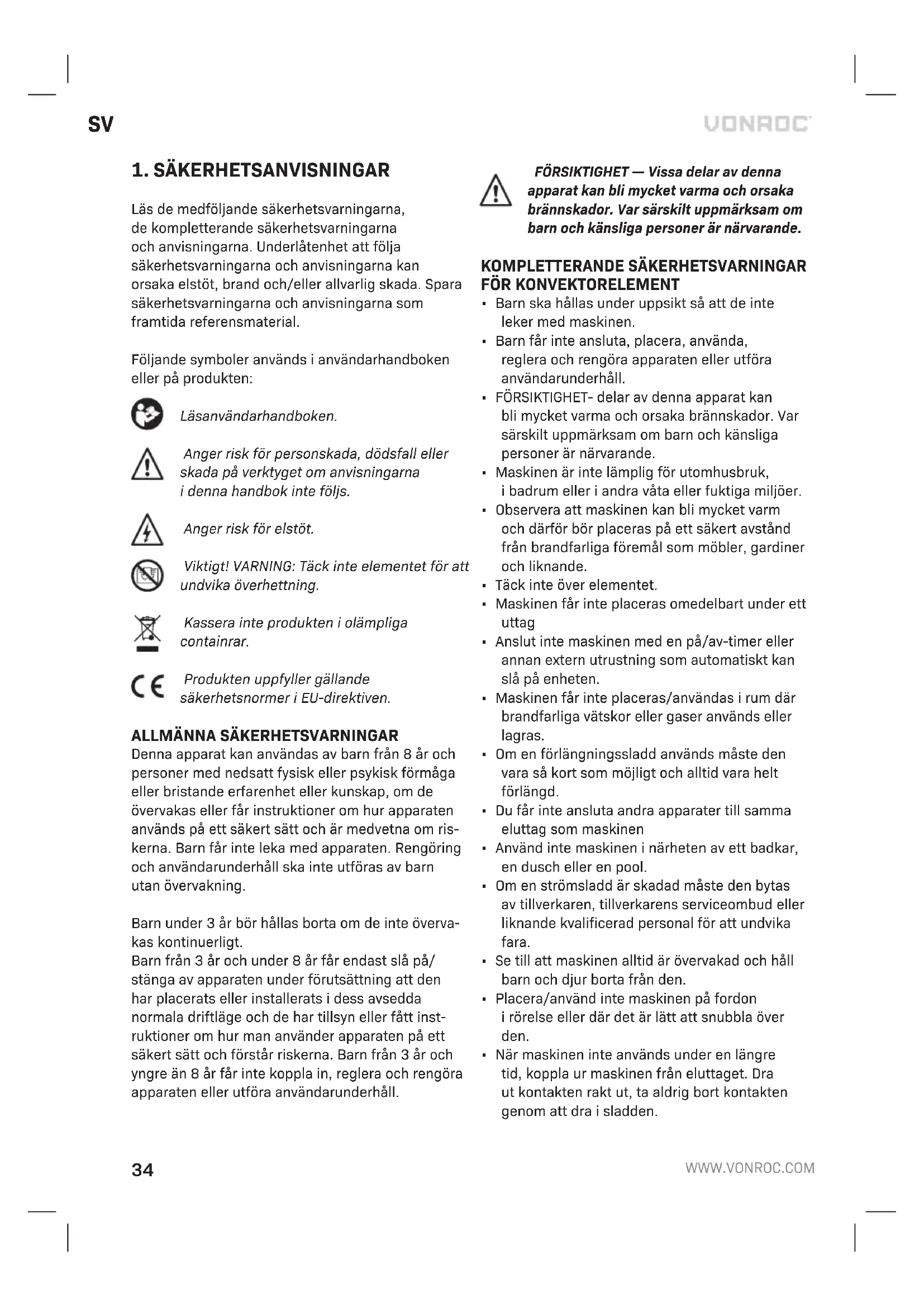Läs de medföljande säkerhetsvarningarna, de kompletterande säkerhetsvarningarna och anvisningarna. Underlåtenhet att följa säkerhetsvarningarna och anvisningarna kan orsaka elstöt, brand och/eller allvarlig skada. Spara säkerhetsvarningarna och anvisningarna som framtida referensmaterial. Följande symboler används ianvändarhandboken eller på produkten: Läs användarhandboken. Anger risk för personskada, dödsfall eller skada på verktyget om anvisningarna idenna handbok inte följs. Anger risk för elstöt. Viktigt! VARNING: Täck inte elementet för att undvika överhettning. Kassera inte produkten iolämpliga containrar. Produkten uppfyller gällande säkerhetsnormer iEU-direktiven.