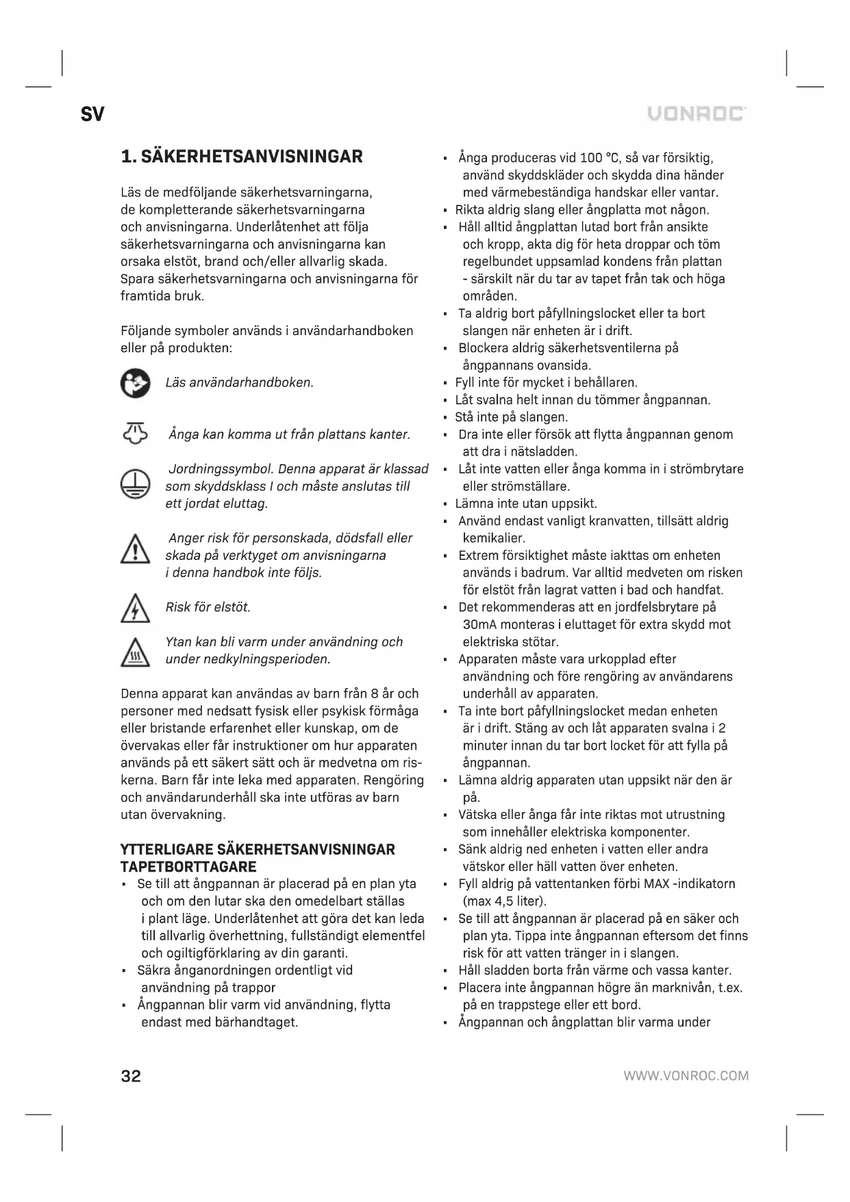 Varning! Innan du utför något underhåll, stäng av och koppla ur apparaten och låt den svalna. Skölj ångpannan ibland med kranvatten tills det är klart. Använd inte kemiska tillsatser. Enheten/verktyget har konstruerats för att arbeta under lång tid med minimalt underhåll. Med rätt underhåll och regelbunden rengöring behåller verktyget sin prestanda. FELSÖKNING Enheten kokar inte Enheten hade förmodligen inte stått tillräckligt länge för att svalna- se avsnittet om säkerhetsavstängning. Kontrollera att säkringen ikontakten är bra och har en effekt på 13 ampere. Om du använder en förlängningssladd, kontrollera att den är märkt till minst 10 ampere och helt avrullad. Enheten läcker ånga från tryckavlastningsventilen Övertrycksventilen är en speciell lågtrycksventil och kan inte ersättas av någon annan ventil. Om det läcker ånga från ventilen är den troligaste orsaken blockering i slangen. Låt slangen svalna, tabort slangen och kontrollera om den är blockerad. Kontrollera alltid inloppet i verktyget du använder. Under inga omständigheter tvinga ventilen. Detta fungerar för ditt skydd. MILJÖ Felaktig och/eller kasserad elektrisk eller elektronisk utrustning måste lämnas in på lämpliga återvinningsstationer. Endast för EU-länder Kassera inte elverktyg i hushållsavfall. Enligt den europeiska riktlinjen 2012/19/EU om kasserad elektrisk och elektronisk utrustning och dess tillämpning i nationell rätt måste elverktyg som inte längre är användbara samlas in separat och kasseras på ett miljövänligt sätt. GARANTI VONROC-produkter är utvecklade enligt högsta kvalitetsstandard och garanteras fria från defekter ibåde material och utförande under den period som lagen föreskriver från och med inköpsdatumet. Om produkten skulle utveckla fel under denna period på grund av defekt material och/eller utförande, kontakta då VONROC direkt. Följande omständigheter är undantagna från denna garanti: