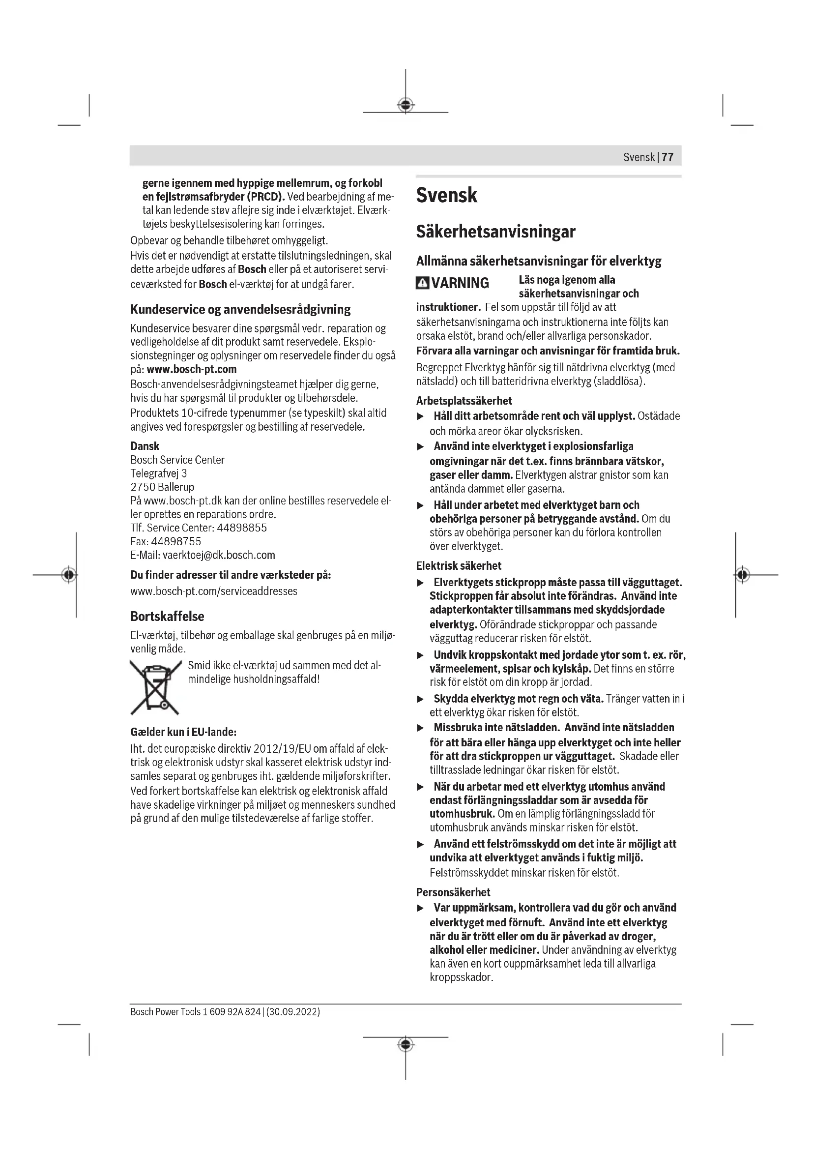 Mätningen av den bullernivå som anges i denna anvisning har utförts enligt en mätmetod som är standardiserad och kan användas vid jämförelse av olika elverktyg. Mätmetoden är även lämplig för preliminär bedömning av vibrationsbelastningen. Den angivna vibrationsnivån representerar den huvudsakliga användningen av elverktyget. Om däremot elverktyget används för andra ändamål och med andra insatsverktyg eller inte underhållits ordentligt kan vibrationsnivån avvika. Då kan vibrationsbelastningen under arbetsperioden öka betydligt. För en exakt bedömning av vibrationsbelastningen bör även de tider beaktas när elverktyget är frånkopplat eller är igång, men inte används. Detta reducerar tydligt vibrationsbelastningen för den totala arbetsperioden. Bestäm extra säkerhetsåtgärder för att skydda operatören mot vibrationernas inverkan t.ex.: underhåll av elverktyget och insatsverktygen, att hålla händerna varma, organisation av arbetsförloppen. Montage Montera skyddsanordning u Dra stickproppen ur nätuttaget innan arbeten utförs på elverktyget. Bosch Power Tools 1 609 92A 824 | (30.09.2022)82 | Svensk Anmärkning: Om slipskivan brustit under drift eller stödanordningarna på spängskyddet/elverktyget skadats, måste berörda delar/elverktyget bytas ut eller för service skickas till kundtjänst. För adresser, se avsnittet "Kundtjänst och användningsrådgivning". Skyddskåpa för slipning Sätt på skyddskåpan (6) på spindelhalsen. Anpassa skyddskåpans (6) position till arbetsstegets krav och arretera skyddskåpan (6) med arreteringsskruven (7). u Ställ in skyddskåpan (6) så att gnistor inte sprutas mot användaren. Skyddskåpa vid kapning u Använd alltid skyddskåpa vid kapning med bundna slipmedel(14). u Vid kapning i sten bör en tillräckligt god dammutsugning anordnas. Skyddskåpan för kapning (14) monteras såsom skyddskåpan för slipning (6). Bortsugningskåpa för kapning med styrsläde För montering av utsugshuven för kapning med styrsläde(23), beakta bruksanvisningen för utsugshuven. Tilläggshandtag u Använd endast elverktyget med tilläggshandtaget(3). Skruva fast tilläggshandtaget (3) till höger eller vänster på drevhuvudet, beroende på arbetssättet. Handskydd u Vid arbeten med gummisliptallriken (18) eller koppborsten/solfjädersslipskivan monterar du alltid handskyddet (16). Fäst handskyddet (16) med tilläggshandtaget (3). Montera slipverktyg u Dra stickproppen ur nätuttaget innan arbeten utförs på elverktyget. u Rör inte slip- och kapskivorna innan de svalnat. Skivorna blir mycket heta vid arbetet. Rengör slipspindeln (5) och alla delar som ska monteras. För att spänna och lossa slipverktygen trycker du på spindellåsknappen (1) för att arretera slipspindeln. u Tryck ned spindellåsknappen endast när slipspindeln står stilla. I annat fall kan elverktyget skadas. Slip-/kapningsskiva Beakta slipverktygets mått. Håldiametern måste passa till fästflänsen. Använd inga adaptrar eller reduceringsdelar. Var vid användningen av diamant-kapningsskivor noga med att vridriktningspilen på diamant-kapningsskivan och elverktygets vridriktning (se vridriktningspilen på kapslingen) stämmer överens. Monteringens ordningsföljd framgår av grafiksidan. För infästning av slip-/kapskivan lossa spännmuttern(10) och dra sedan fast den med tvåstiftsnyckeln (se „Snabbspänningsmutter “, Sidan82). u Kontrollera efter montering och före start av slipverktyget att det monterats på rätt sätt och kan rotera fritt. Kontrollera att slipverktyget inte berör sprängskyddet eller andra delar. I fästflänsen (8) har en plastdel (O-ring) satts in runt centreringskragen. Om O-ringen saknas eller är skadad, ska fästflänsen (8) bytas ut innan fortsatt användning. Solfjädersslipskiva u Montera alltid handskyddet (16) vid arbeten med solfjädersslipskivan. Gummi-sliptallrik u Montera alltid handskyddet(16) vid arbeten med gummisliptallriken (18). Monteringens ordningsföljd framgår av grafiksidan. Innan monteringen av gummisliptallriken (18) sätter du på de 2 distansskivorna (17) på slipspindeln (5). Skruva på rundmuttern (20) och dra åt denna med tvåhålsnyckeln. Koppborste/skivborste u Montera alltid handskyddet (16) vid arbeten med solfjädersslipskivan. Monteringens ordningsföljd framgår av grafiksidan. Koppborsten/skivborsten skall gå att skruva så långt på slipspindeln så att den ligger an fast mot slipspindelflänsen i slutet av slipspindelgängningen. Spänn fast koppborsten/ skivborsten med en gaffelnyckel. Snabbspänningsmutter För enkelt byte av slipverktyg utan att använda ytterligare verktyg kan du använda snabbspänningsmuttern (12) istället för spännmuttern (10). u Snabbspänningsmuttern(12) får endast användas för slip-eller kapskivor eller skivborstar med håldiameter 22,2mm. Använd endast en felfri, oskadad snabbspännmutter (12). Var vid påskruvningen uppmärksam på att snabbspänningsmutterns (12) textförsedda sida inte pekar mot slipskivan. Pilen skall vara riktad mot indexmärket (24). (24) Tryck på spindellåsknappen (1) för att arretera slipspindeln. För att dra åt spindelspännmuttern skruvar du slipskivan kraftigt medurs. 1 609 92A 824 | (30.09.2022) Bosch Power ToolsSvensk | 83 En korrekt fäst och oskadad snabbspänningsmutter kan du lossa genom att vrida den räfflade ringen moturs för hand. Lossa aldrig en åtdragen snabbspänningsmutter med en tång, utan används kombinyckeln. Sätt an kombinyckeln på det sätt som visas på bilden. Tillåtna slipverktyg Du kan använda alla slipverktyg som anges i denna bruksanvisning. Det tillåtna varvtalet [v/min] resp. periferihastighet [m/s] hos de använda slipverktygen skall minst uppfylla kraven i följande tabell. Beakta därför det tillåtna varvtalet resp. periferihastigheten på slipverktygets etikett. max. [mm] [mm] D b d [v/min] [m/s] 230 8 22,2 6500 80 180 – – 6500 80 100 30 M14 8500 45 Damm