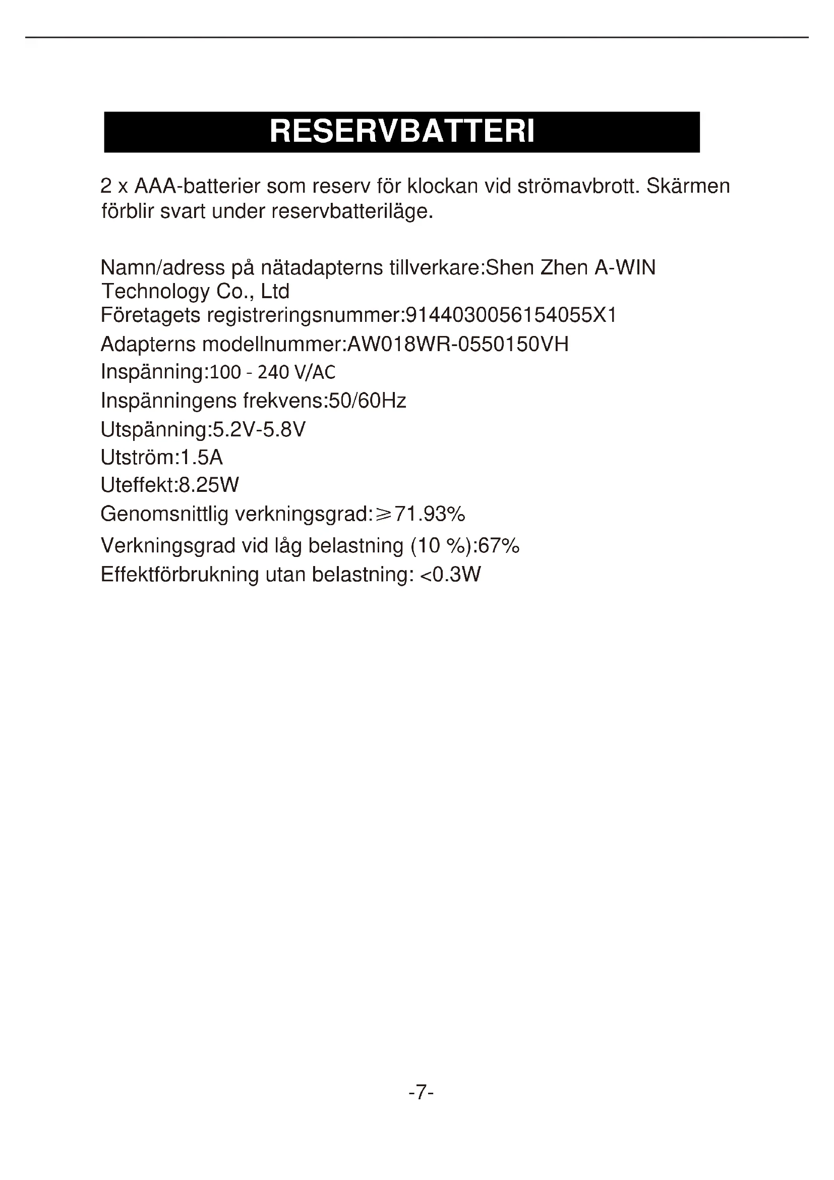 Namn/adress på nitadapterns tillverkare:Shen Zhen A-WIN
