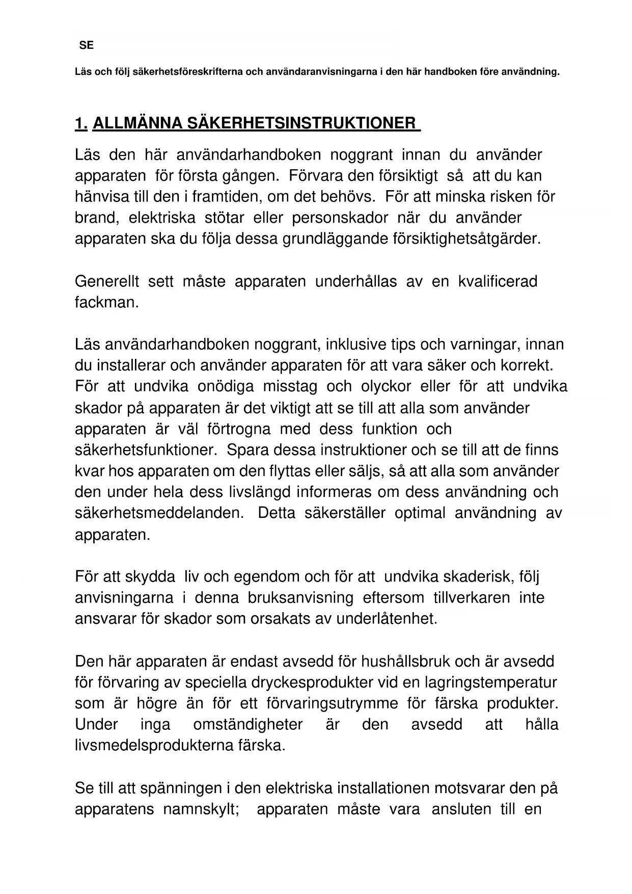 Apparaten är avsedd att förvara drycker i vanligt hushåll enligtSE beskrivningen i det här instruktionshäftet.