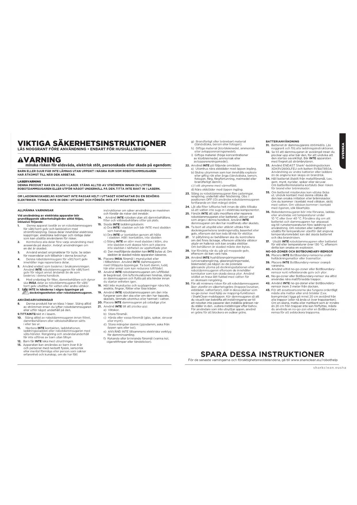 hantering av robotdammsugaren i strid med detta medföljande instruktionshäfte från Shark®.