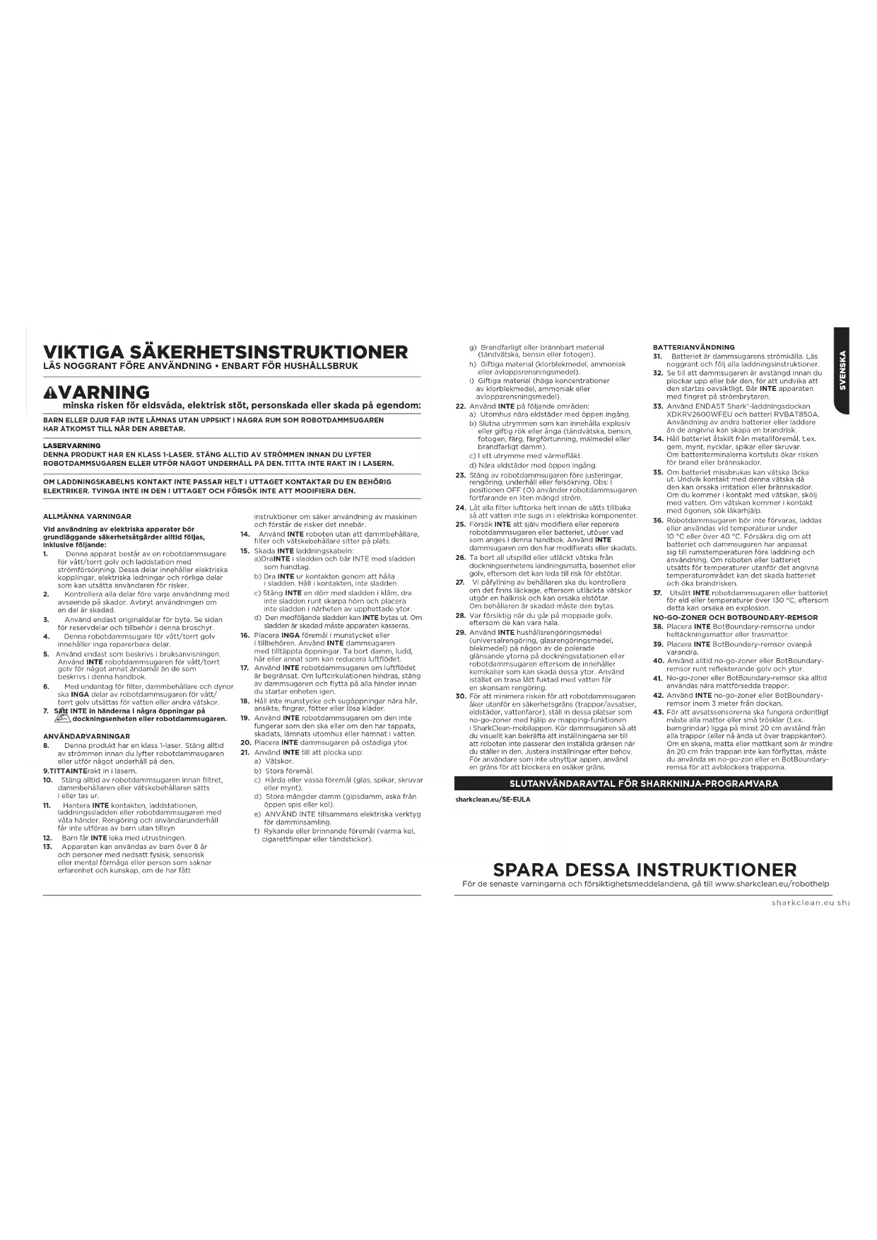 För de senaste varningarna och försiktighetsmeddelandena, gå till www.sharkclean.eu/robothelp OM LADDNINGSKABELNS KONTAKT INTE PASSAR HELT I UTTAGET KONTAKTAR DU EN BEHÖRIG ELEKTRIKER. TVINGA INTE IN DEN I UTTAGET OCH FÖRSÖK INTE ATT MODIFIERA DEN.