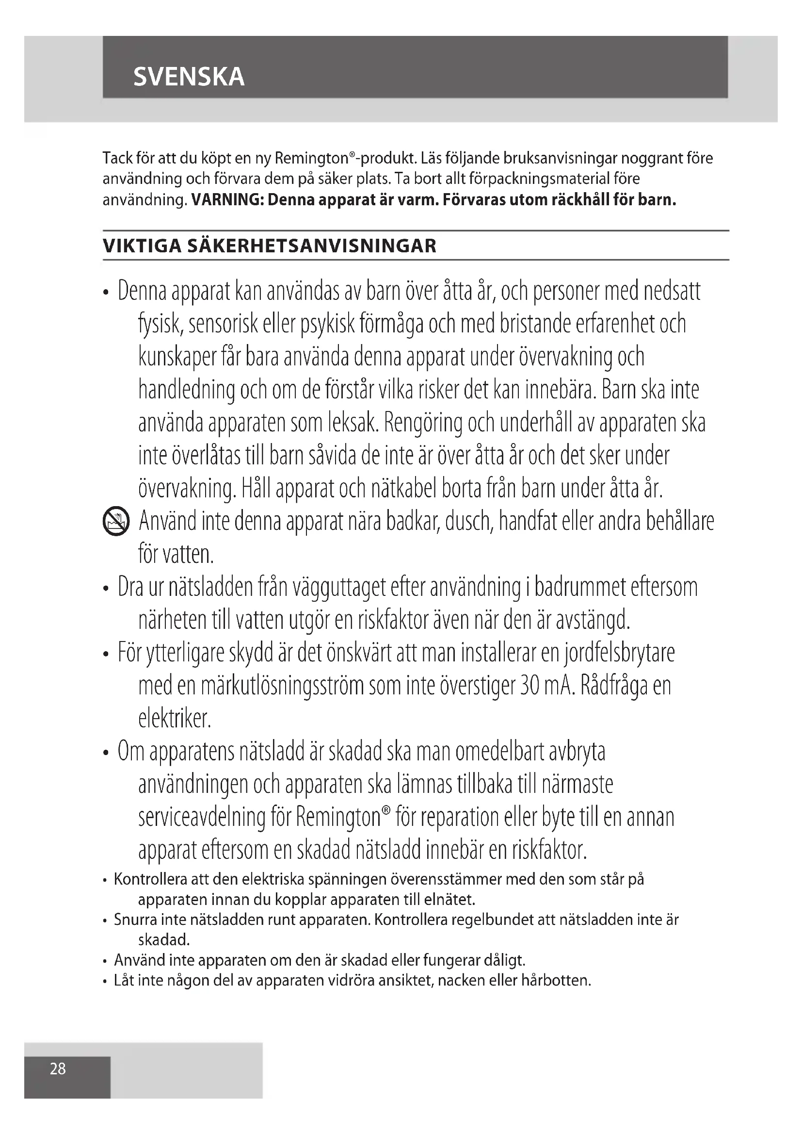 AE28 SVENSKA Tack för att du köpt en ny Remington®-produkt. Läs följande bruksanvisningar noggrant före användning och förvara dem på säker plats. Ta bort allt förpackningsmaterial före användning. VARNING: Denna apparat är varm. Förvaras utom räckhåll för barn.