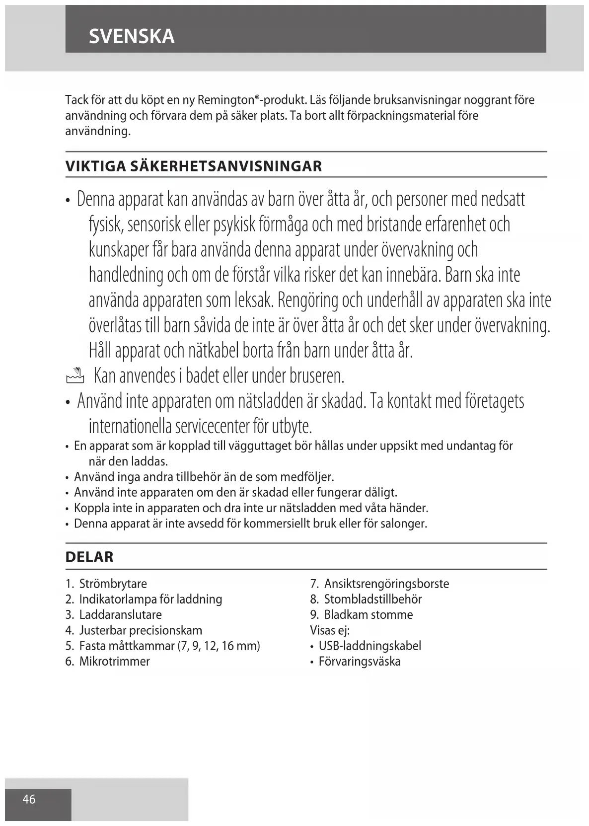 AE46 Tack för att du köpt en ny Remington®-produkt. Läs följande bruksanvisningar noggrant före användning och förvara dem på säker plats. Ta bort allt förpackningsmaterial före användning.