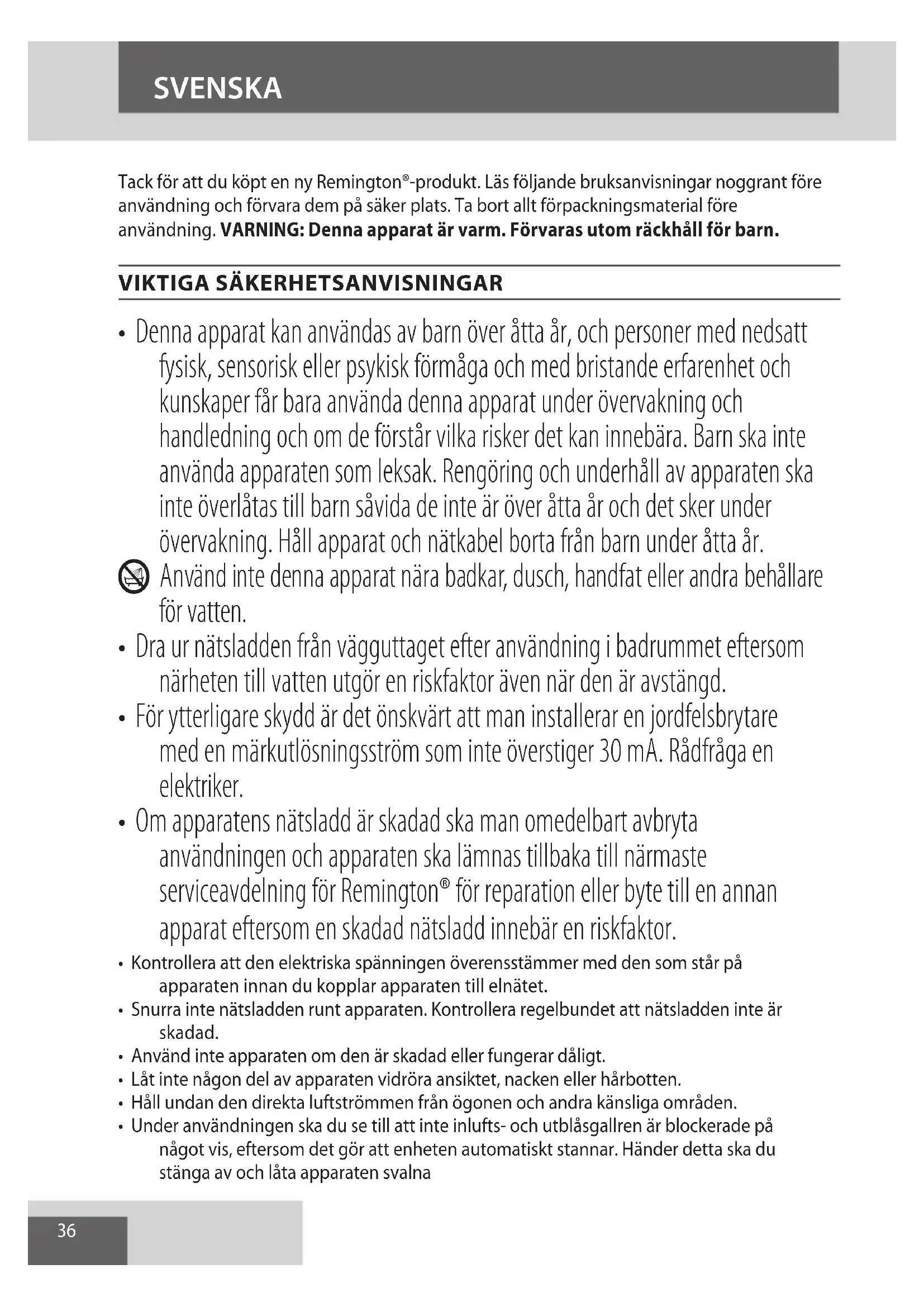 AE36 SVENSKA Tack för att du köpt en ny Remington®-produkt. Läs följande bruksanvisningar noggrant före användning och förvara dem på säker plats. Ta bort allt förpackningsmaterial före användning. VARNING: Denna apparat är varm. Förvaras utom räckhåll för barn.