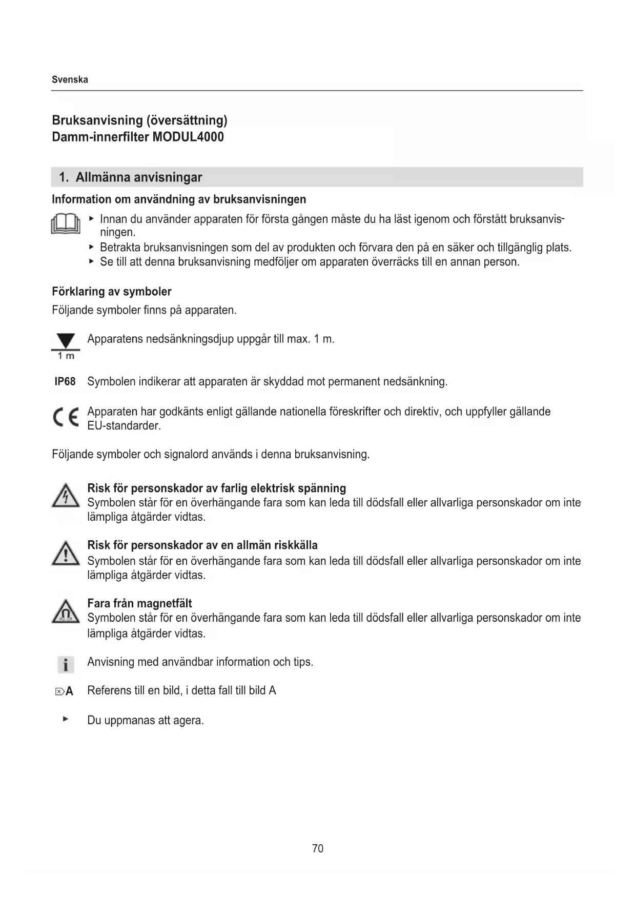 ningen. ▶ Betrakta bruksanvisningen som del av produkten och förvara den på en säker och tillgänglig plats. ▶ Se till att denna bruksanvisning medföljer om apparaten överräcks till en annan person. Förklaring av symboler Följande symboler nns på apparaten. Apparatens nedsänkningsdjup uppgår till max. 1 m. Symbolen indikerar att apparaten är skyddad mot permanent nedsänkning. Apparaten har godkänts enligt gällande nationella föreskrifter och direktiv, och uppfyller gällande EU-standarder. Följande symboler och signalord används i denna bruksanvisning. Risk för personskador av farlig elektrisk spänning Symbolen står för en överhängande fara som kan leda till dödsfall eller allvarliga personskador om inte lämpliga åtgärder vidtas. Risk för personskador av en allmän riskkälla Symbolen står för en överhängande fara som kan leda till dödsfall eller allvarliga personskador om inte lämpliga åtgärder vidtas. Fara från magnetfält Symbolen står för en överhängande fara som kan leda till dödsfall eller allvarliga personskador om inte lämpliga åtgärder vidtas. Anvisning med användbar information och tips. Referens till en bild, i detta fall till bild A Du uppmanas att agera. IP68 ⌦A71 Svenska