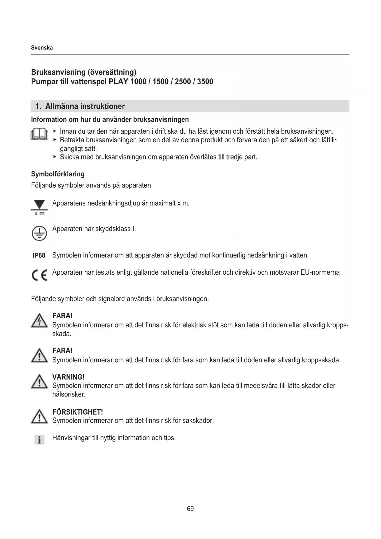 gängligt sätt. ▶ Skicka med bruksanvisningen om apparaten överlåtes till tredje part. Symbolförklaring Följande symboler används på apparaten. Apparatens nedsänkningsdjup är maximalt x m. Apparaten har skyddsklass I. Symbolen informerar om att apparaten är skyddad mot kontinuerlig nedsänkning i vatten. Apparaten har testats enligt gällande nationella föreskrifter och direktiv och motsvarar EU-normerna Följande symboler och signalord används i bruksanvisningen. FARA! Symbolen informerar om att det nns risk för elektrisk stöt som kan leda till döden eller allvarlig kropps