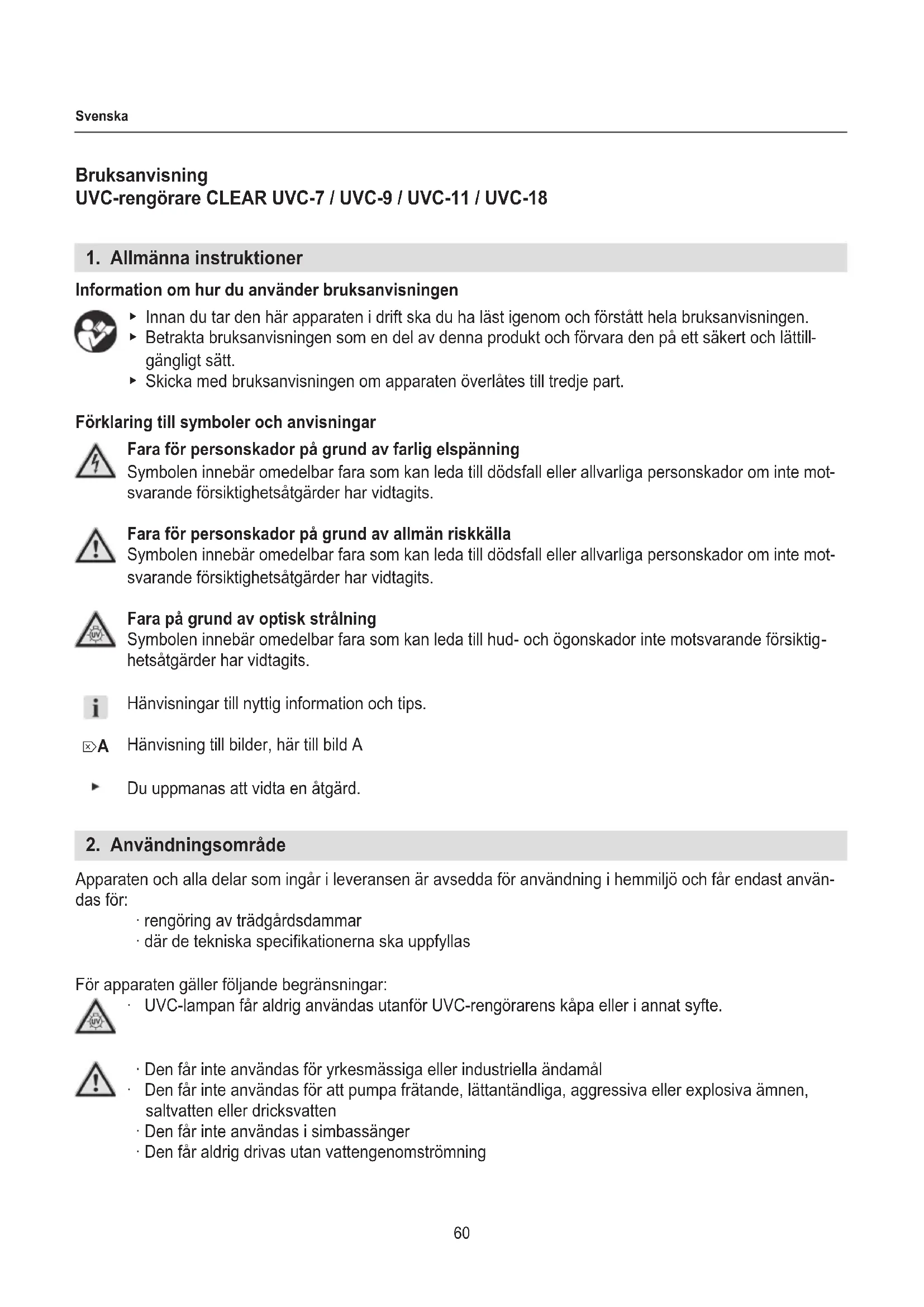 Apparaten och alla delar som ingår i leveransen är avsedda för användning i hemmiljö och får endast använ- das för: ‧ rengöring av trädgårdsdammar ‧ där de tekniska specikationerna ska uppfyllas För apparaten gäller följande begränsningar: ‧ UVC-lampan får aldrig användas utanför UVC-rengörarens kåpa eller i annat syfte. ‧ Den får inte användas för yrkesmässiga eller industriella ändamål ‧ Den får inte användas för att pumpa frätande, lättantändliga, aggressiva eller explosiva ämnen, saltvatten eller dricksvatten ‧ Den får inte användas i simbassänger ‧ Den får aldrig drivas utan vattengenomströmning ⌦A61 Svenska