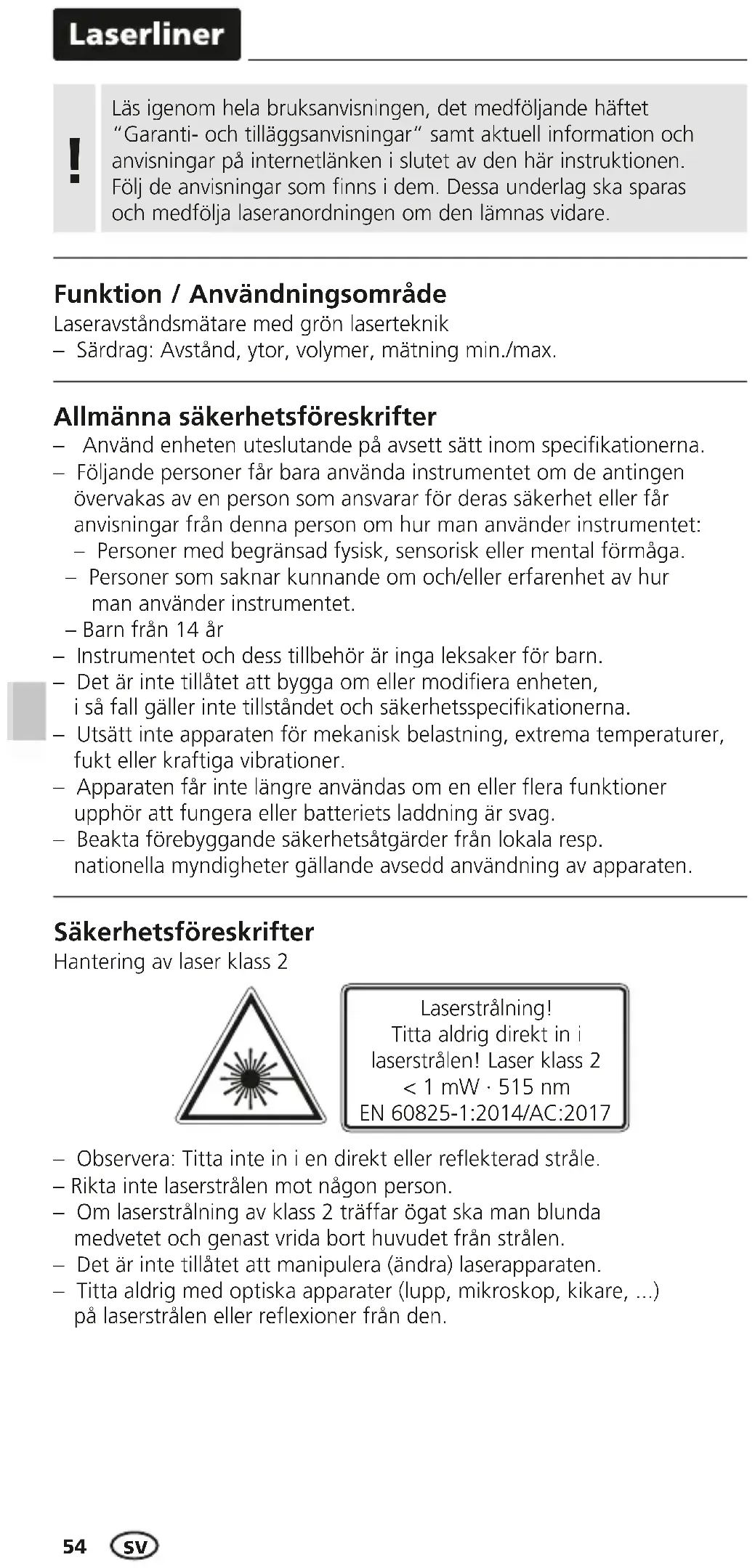 Allmänna säkerhetsföreskrifter – Använd enheten uteslutande på avsett sätt inom specikationerna. – Följande personer får bara använda instrumentet om de antingen övervakas av en person som ansvarar för deras säkerhet eller får anvisningar från denna person om hur man använder instrumentet: – Personer med begränsad fysisk, sensorisk eller mental förmåga. – Personer som saknar kunnande om och/eller erfarenhet av hur man använder instrumentet. – Barn från 14 år – Instrumentet och dess tillbehör är inga leksaker för barn. – Det är inte tillåtet att bygga om eller modiera enheten, i så fall gäller inte tillståndet och säkerhetsspecikationerna. – Utsätt inte apparaten för mekanisk belastning, extrema temperaturer, fukt eller kraftiga vibrationer. – Apparaten får inte längre användas om en eller era funktioner upphör att fungera eller batteriets laddning är svag. – Beakta förebyggande säkerhetsåtgärder från lokala resp. nationella myndigheter gällande avsedd användning av apparaten. – Observera: Titta inte in i en direkt eller reekterad stråle. – Rikta inte laserstrålen mot någon person. – Om laserstrålning av klass 2 träffar ögat ska man blunda medvetet och genast vrida bort huvudet från strålen. – Det är inte tillåtet att manipulera (ändra) laserapparaten. – Titta aldrig med optiska apparater (lupp, mikroskop, kikare, ...) på laserstrålen eller reexioner från den. Säkerhetsföreskrifter Hantering av laser klass 2 Laserstrålning! Titta aldrig direkt in i laserstrålen! Laser klass 2 < 1 mW · 515 nm EN 60825-1:2014/AC:2017 Funktion / Användningsområde Laseravståndsmätare med grön laserteknik – Särdrag: Avstånd, ytor, volymer, mätning min./max. Läs igenom hela bruksanvisningen, det medföljande häftet “Garanti- och tilläggsanvisningar“ samt aktuell information och anvisningar på internetlänken i slutet av den här instruktionen. Följ de anvisningar som finns i dem. Dessa underlag ska sparas och medfölja laseranordningen om den lämnas vidare. !LaserRange-Master Gi3