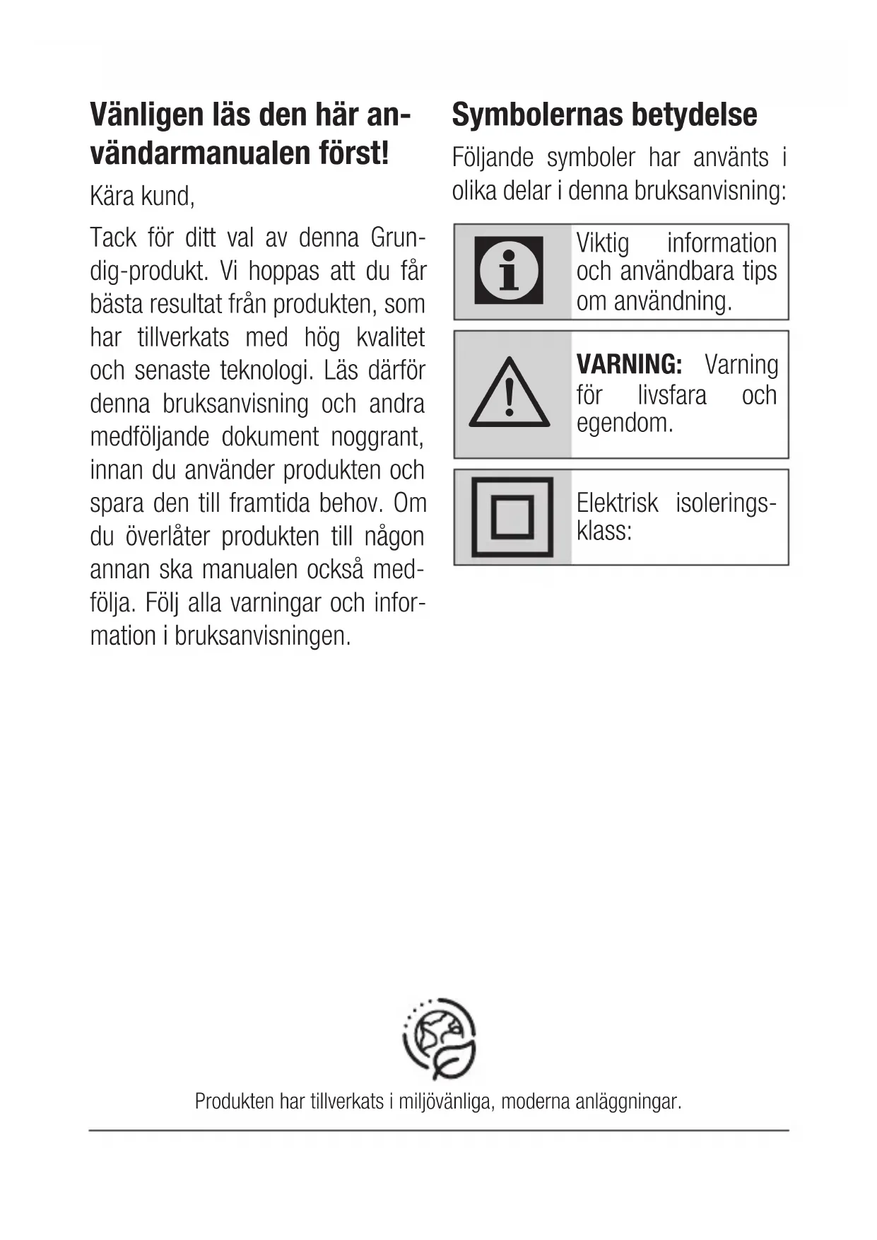 - Sørg for at apparatet holdes util- gjengelig for barn. For igangkjøring, generell bruk og rengjøring, følg instruksjonene på side 4-5 i denne bruksanvisningen.Vänligen läs den här an- vändarmanualen först! Kära kund, Tack för ditt val av denna Grun- dig-produkt. Vi hoppas att du får bästa resultat från produkten, som har tillverkats med hög kvalitet och senaste teknologi. Läs därför denna bruksanvisning och andra medföljande dokument noggrant, innan du använder produkten och spara den till framtida behov. Om du överlåter produkten till någon annan ska manualen också med- följa. Följ alla varningar och infor- mation i bruksanvisningen. Symbolernas betydelse Följande symboler har använts i olika delar i denna bruksanvisning: