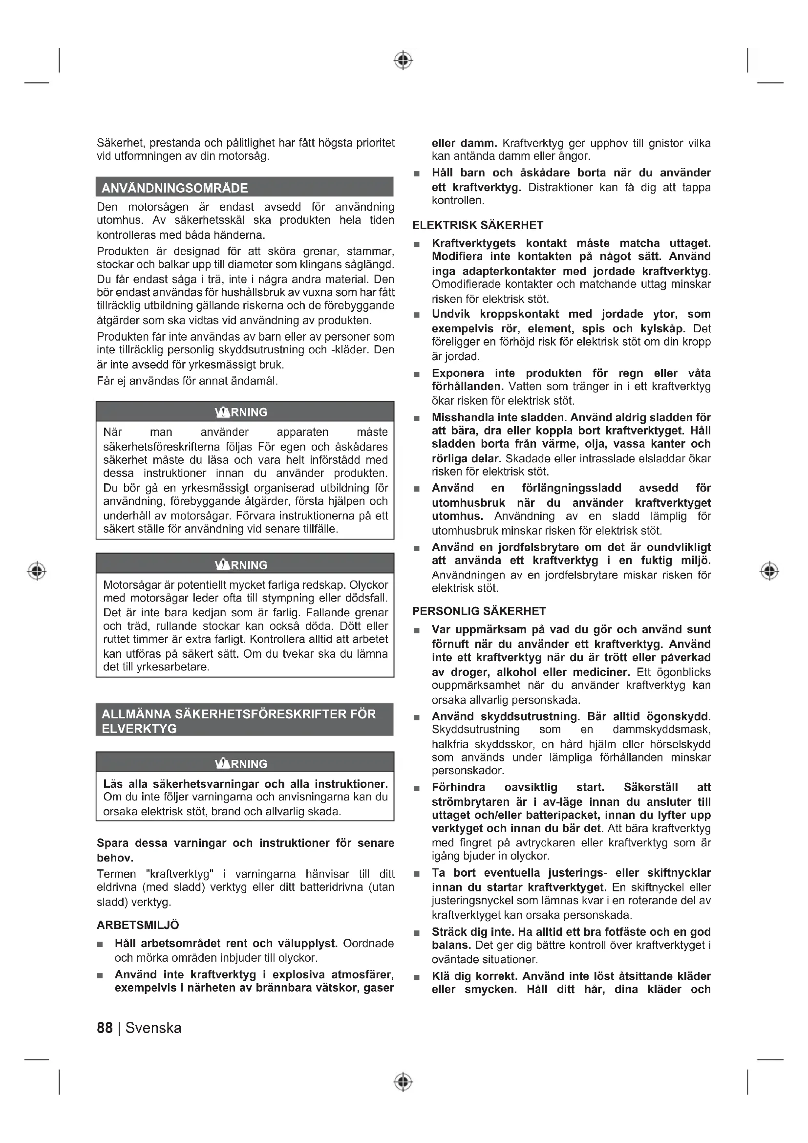 Den motorsågen är endast avsedd för användning utomhus. Av säkerhetsskäl ska produkten hela tiden kontrolleras med båda händerna. Produkten är designad för att sköra grenar, stammar, stockar och balkar upp till diameter som klingans såglängd. Du får endast såga i trä, inte i några andra material. Den bör endast användas för hushållsbruk av vuxna som har fått tillräcklig utbildning gällande riskerna och de förebyggande åtgärder som ska vidtas vid användning av produkten. Produkten får inte användas av barn eller av personer som inte tillräcklig personlig skyddsutrustning och -kläder. Den är inte avsedd för yrkesmässigt bruk. Får ej användas för annat ändamål. VARNING När man använder apparaten måste säkerhetsföreskrifterna följas För egen och åskådares säkerhet måste du läsa och vara helt införstådd med dessa instruktioner innan du använder produkten. Du bör gå en yrkesmässigt organiserad utbildning för användning, förebyggande åtgärder, första hjälpen och underhåll av motorsågar. Förvara instruktionerna på ett säkert ställe för användning vid senare tillfälle. VARNING Motorsågar är potentiellt mycket farliga redskap. Olyckor med motorsågar leder ofta till stympning eller dödsfall. Det är inte bara kedjan som är farlig. Fallande grenar och träd, rullande stockar kan också döda. Dött eller ruttet timmer är extra farligt. Kontrollera alltid att arbetet kan utföras på säkert sätt. Om du tvekar ska du lämna det till yrkesarbetare. ALLMÄNNA SÄKERHETSFÖRESKRIFTER FÖR ELVERKTYG VARNING Läs alla säkerhetsvarningar och alla instruktioner. Om du inte följer varningarna och anvisningarna kan du orsaka elektrisk stöt, brand och allvarlig skada. Spara dessa varningar och instruktioner för senare behov. Termen "kraftverktyg" i varningarna hänvisar till ditt eldrivna (med sladd) verktyg eller ditt batteridrivna (utan sladd) verktyg. ARBETSMILJÖ ■ Håll arbetsområdet rent och välupplyst. Oordnade och mörka områden inbjuder till olyckor. ■ Använd inte kraftverktyg i explosiva atmosfärer, exempelvis i närheten av brännbara vätskor, gaser eller damm. Kraftverktyg ger upphov till gnistor vilka kan antända damm eller ångor. ■ Håll barn och åskådare borta när du använder ett kraftverktyg. Distraktioner kan få dig att tappa kontrollen.