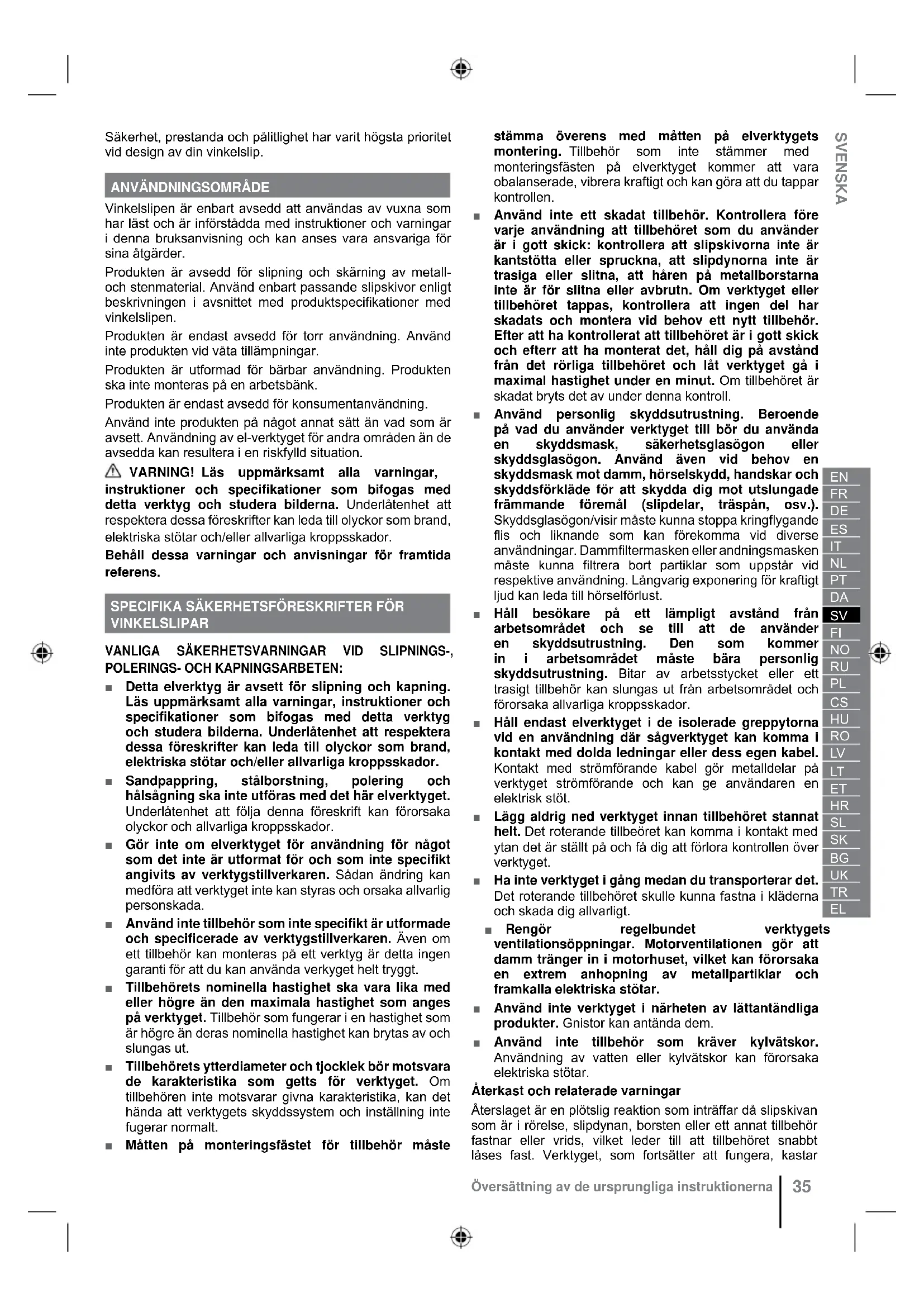 VINKELSLIPAR VANLIGA SÄKERHETSVARNINGAR VID SLIPNINGS-, POLERINGS- OCH KAPNINGSARBETEN: ■ Detta elverktyg är avsett för slipning och kapning. Läs uppmärksamt alla varningar, instruktioner och specifikationer som bifogas med detta verktyg och studera bilderna. Underlåtenhet att respektera dessa föreskrifter kan leda till olyckor som brand, elektriska stötar och/eller allvarliga kroppsskador. ■ Sandpappring, stålborstning, polering och hålsågning ska inte utföras med det här elverktyget. Underlåtenhet att följa denna föreskrift kan förorsaka olyckor och allvarliga kroppsskador. ■ Gör inte om elverktyget för användning för något som det inte är utformat för och som inte specifikt angivits av verktygstillverkaren. Sådan ändring kan medföra att verktyget inte kan styras och orsaka allvarlig personskada. ■ Använd inte tillbehör som inte specifikt är utformade och specificerade av verktygstillverkaren. Även om ett tillbehör kan monteras på ett verktyg är detta ingen garanti för att du kan använda verkyget helt tryggt. ■ Tillbehörets nominella hastighet ska vara lika med eller högre än den maximala hastighet som anges på verktyget. Tillbehör som fungerar i en hastighet som är högre än deras nominella hastighet kan brytas av och slungas ut. ■ Tillbehörets ytterdiameter och tjocklek bör motsvara de karakteristika som getts för verktyget. Om tillbehören inte motsvarar givna karakteristika, kan det hända att verktygets skyddssystem och inställning inte fugerar normalt. ■ Måtten på monteringsfästet för tillbehör måste stämma överens med måtten på elverktygets montering. Tillbehör som inte stämmer med monteringsfästen på elverktyget kommer att vara obalanserade, vibrera kraftigt och kan göra att du tappar kontrollen. ■ Använd inte ett skadat tillbehör. Kontrollera före varje användning att tillbehöret som du använder är i gott skick: kontrollera att slipskivorna inte är kantstötta eller spruckna, att slipdynorna inte är trasiga eller slitna, att håren på metallborstarna inte är för slitna eller avbrutn. Om verktyget eller tillbehöret tappas, kontrollera att ingen del har skadats och montera vid behov ett nytt tillbehör. Efter att ha kontrollerat att tillbehöret är i gott skick och efterr att ha monterat det, håll dig på avstånd från det rörliga tillbehöret och låt verktyget gå i maximal hastighet under en minut. Om tillbehöret är skadat bryts det av under denna kontroll. ■ Använd personlig skyddsutrustning. Beroende på vad du använder verktyget till bör du använda en skyddsmask, säkerhetsglasögon eller skyddsglasögon. Använd även vid behov en skyddsmask mot damm, hörselskydd, handskar och skyddsförkläde för att skydda dig mot utslungade främmande föremål (slipdelar, träspån, osv.). Skyddsglasögon/visir måste kunna stoppa kringflygande flis och liknande som kan förekomma vid diverse användningar. Dammfiltermasken eller andningsmasken måste kunna filtrera bort partiklar som uppstår vid respektive användning. Långvarig exponering för kraftigt ljud kan leda till hörselförlust. ■ Håll besökare på ett lämpligt avstånd från arbetsområdet och se till att de använder en skyddsutrustning. Den som kommer in i arbetsområdet måste bära personlig skyddsutrustning. Bitar av arbetsstycket eller ett trasigt tillbehör kan slungas ut från arbetsområdet och förorsaka allvarliga kroppsskador. ■ Håll endast elverktyget i de isolerade greppytorna vid en användning där sågverktyget kan komma i kontakt med dolda ledningar eller dess egen kabel. Kontakt med strömförande kabel gör metalldelar på verktyget strömförande och kan ge användaren en elektrisk stöt. ■ Lägg aldrig ned verktyget innan tillbehöret stannat helt. Det roterande tillbeöret kan komma i kontakt med ytan det är ställt på och få dig att förlora kontrollen över verktyget. ■ Ha inte verktyget i gång medan du transporterar det. Det roterande tillbehöret skulle kunna fastna i kläderna och skada dig allvarligt. ■ Rengör regelbundet verktygets ventilationsöppningar. Motorventilationen gör att damm tränger in i motorhuset, vilket kan förorsaka en extrem anhopning av metallpartiklar och framkalla elektriska stötar. ■ Använd inte verktyget i närheten av lättantändliga produkter. Gnistor kan antända dem. ■ Använd inte tillbehör som kräver kylvätskor. Användning av vatten eller kylvätskor kan förorsaka elektriska stötar. Återkast och relaterade varningar Återslaget är en plötslig reaktion som inträffar då slipskivan som är i rörelse, slipdynan, borsten eller ett annat tillbehör fastnar eller vrids, vilket leder till att tillbehöret snabbt låses fast. Verktyget, som fortsätter att fungera, kastar36 Översättning av de ursprungliga instruktionerna då verktyget i motsatt riktning jämfört med tillbehörets användningsriktning. Om till exempel en slipskiva kläms ihop eller vrids inne i arbetsstycket, kan eggen på skivan tryckas in i arbetsstyckets yta, vilket gör att skivan snabbt går ut ur arbetsstycket och slungas mot användaren. Hjulet kan antingen hoppa mot eller bort från operatören, beroende på riktning av hjulet rörelse på platsen för klämskador. I händelse av återslag kan slipskivan även brytas av. Det kan undvikas genom att vidta några försiktighetsåtgärder. ■ Håll hela tiden elverktyget med ett fast grepp med bägge händer och placera kropp och armar så att du kan hålla emot återstuds. Om verktyget har ett hjälphandtag, håll alltid i det för att kunna kontrollera verktyget optimalt i händelse av återslag eller reaktionsmoment vid start av verktyget. Vidta nödvändiga åtgärder för att kunna kontrollera verktyget i händelse av återslag eller reaktionsmoment. ■ Ha aldrig handen i närheten av det roterande tillbehöret för att undvika risker för allvarliga kroppsskador vid återslag. Tillbehör kan kast ö