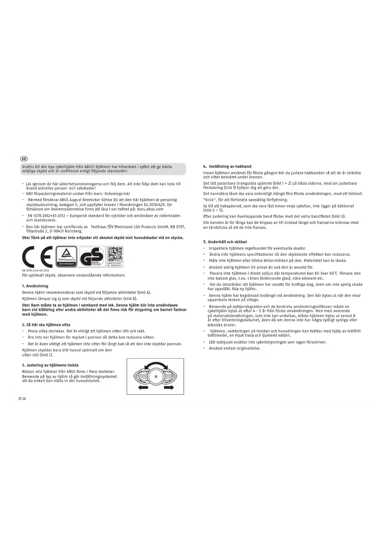 - Härmed försäkrar ABUS August Bremicker Söhne KG att den här hjälmen är personlig skyddsutrustning, kategori II, och uppfyller kraven i förordningen EU 2016/425. EU- försäkran om överensstämmelse finns att läsa i sin helhet på: docs.abus.com