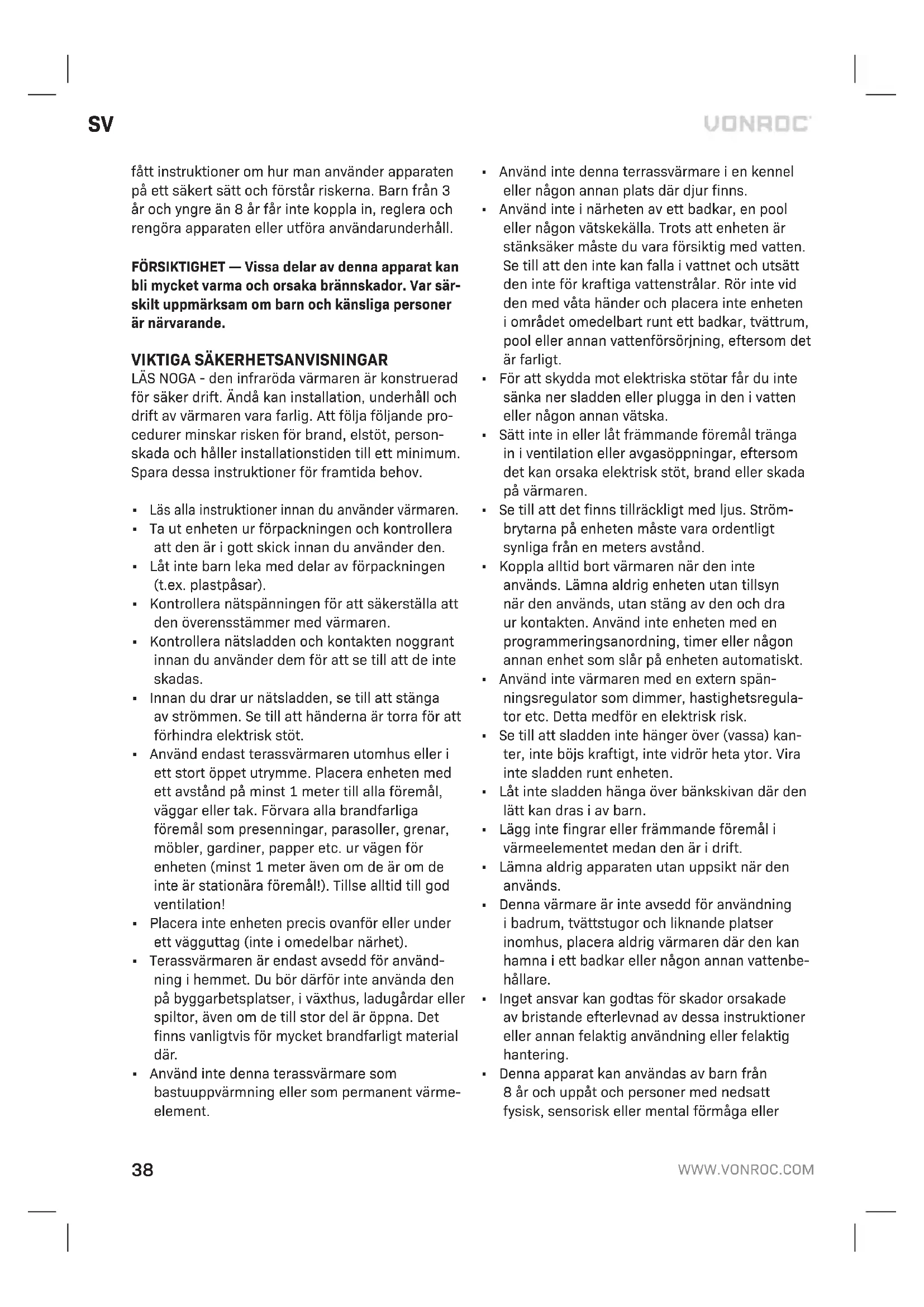 - Använd inte denna terassvärmare som bastuuppvärmning eller som permanent värme- element.