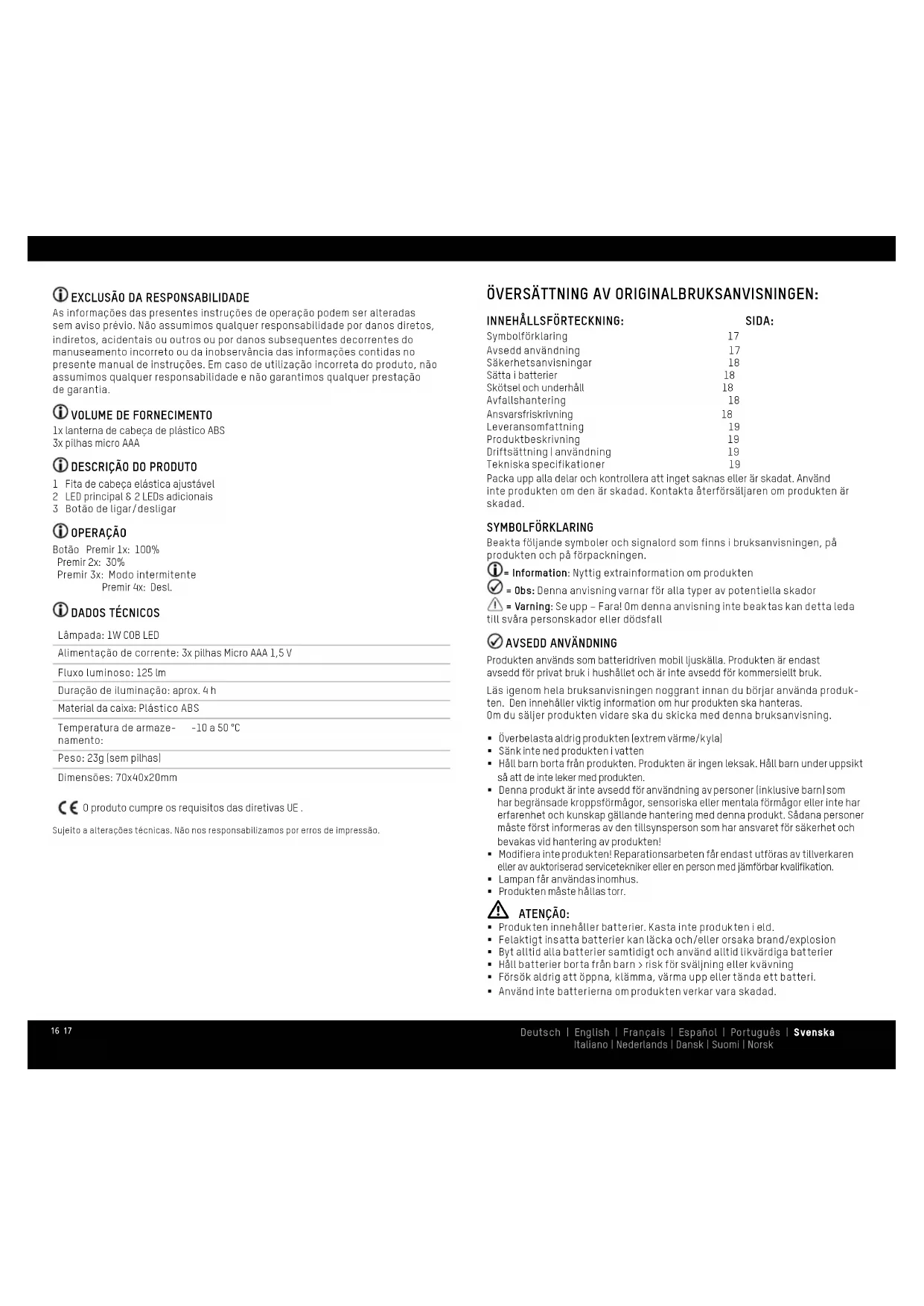 Lâmpada: 1W COB LED Alimentação de corrente: 3x pilhas Micro AAA 1,5 V Fluxo luminoso: 125 lm Duração de iluminação: aprox. 4 h Material da caixa: Plástico ABS Temperatura de armaze- namento: -10 a 50 °C Peso: 23g (sem pilhas) Dimensões: 70x40x20mm O produto cumpre os requisitos das diretivas UE . Sujeito a alterações técnicas. Não nos responsabilizamos por erros de impressão. ÖVERSÄTTNING AV ORIGINALBRUKSANVISNINGEN: INNEHÅLLSFÖRTECKNING: SIDA: Symbolförklaring 17 Avsedd användning 17 Säkerhetsanvisningar 18 Sätta i batterier 18 Skötsel och underhåll 18 Avfallshantering 18 Ansvarsfriskrivning 18 Leveransomfattning 19 Produktbeskrivning 19 Driftsättning | användning 19 Tekniska specifikationer 19 Packa upp alla delar och kontrollera att inget saknas eller är skadat. Använd inte produkten om den är skadad. Kontakta återförsäljaren om produkten är skadad. SYMBOLFÖRKLARING Beakta följande symboler och signalord som finns i bruksanvisningen, på produkten och på förpackningen. = Information: Nyttig extrainformation om produkten = Obs: Denna anvisning varnar för alla typer av potentiella skador = Varning: Se upp – Fara! Om denna anvisning inte beaktas kan detta leda till svåra personskador eller dödsfall