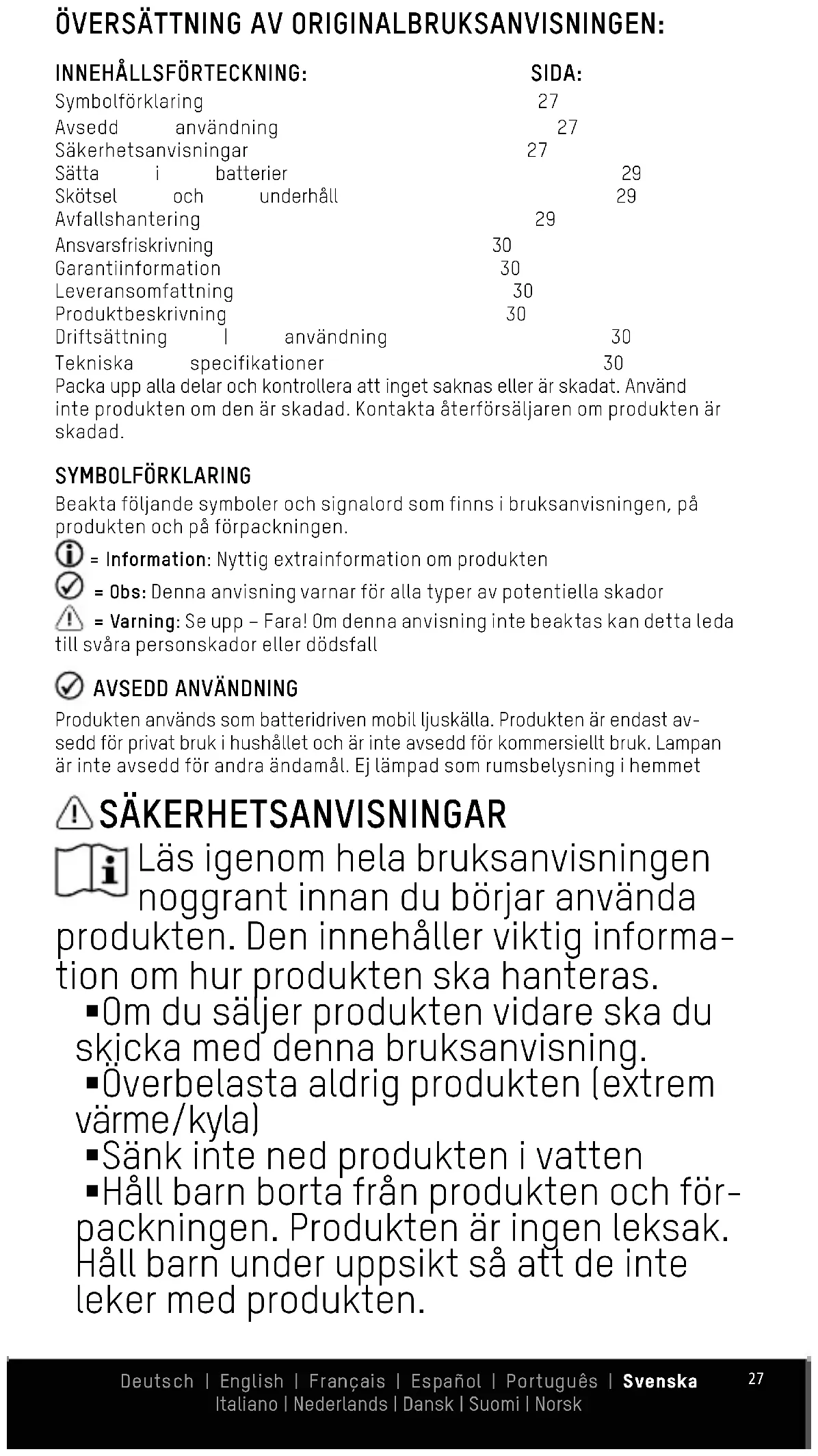 Alcance da luz: 19m Material da caixa: Alumínio Tipo de proteção: IPX3 Temperatura de arm- azenamento: -10 a 50 °C Temperatura de fun- cionamento: -10 a 25 °C Peso: 42,5g (sem pilhas) Dimensões: 95 × 29 × 29mm O produto cumpre os requisitos das diretivas UE . Sujeito a alterações técnicas. Não nos responsabilizamos por erros de impressão. Deutsch | English | Français | Español | Português | Svenska Italiano | Nederlands | Dansk | Suomi | Norsk27 ÖVERSÄTTNING AV ORIGINALBRUKSANVISNINGEN: INNEHÅLLSFÖRTECKNING: SIDA: Symbolförklaring 27 Avsedd användning 27 Säkerhetsanvisningar 27 Sätta i batterier 29 Skötsel och underhåll 29 Avfallshantering 29 Ansvarsfriskrivning 30 Garantiinformation 30 Leveransomfattning 30 Produktbeskrivning 30 Driftsättning | användning 30 Tekniska specifikationer 30 Packa upp alla delar och kontrollera att inget saknas eller är skadat. Använd inte produkten om den är skadad. Kontakta återförsäljaren om produkten är skadad. SYMBOLFÖRKLARING Beakta följande symboler och signalord som finns i bruksanvisningen, på produkten och på förpackningen. = Information: Nyttig extrainformation om produkten = Obs: Denna anvisning varnar för alla typer av potentiella skador = Varning: Se upp – Fara! Om denna anvisning inte beaktas kan detta leda till svåra personskador eller dödsfall