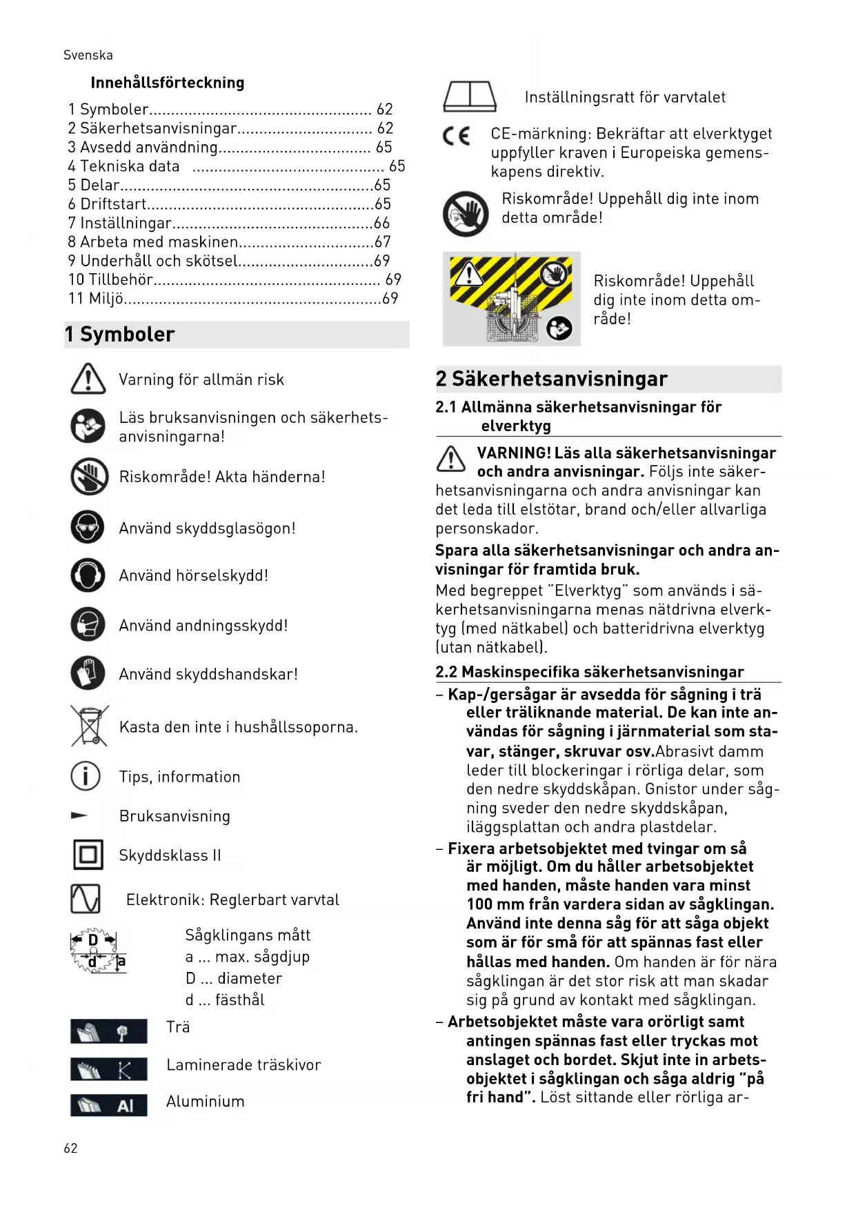 Sågklingans mått a ... max. sågdjup D ... diameter d ... fästhål Trä Laminerade träskivor Aluminium Inställningsratt för varvtalet CE-märkning: Bekräftar att elverktyget uppfyller kraven i Europeiska gemens kapens direktiv. Riskområde! Uppehåll dig inte inom detta område! Riskområde! Uppehåll dig inte inom detta om råde! 2 Säkerhetsanvisningar