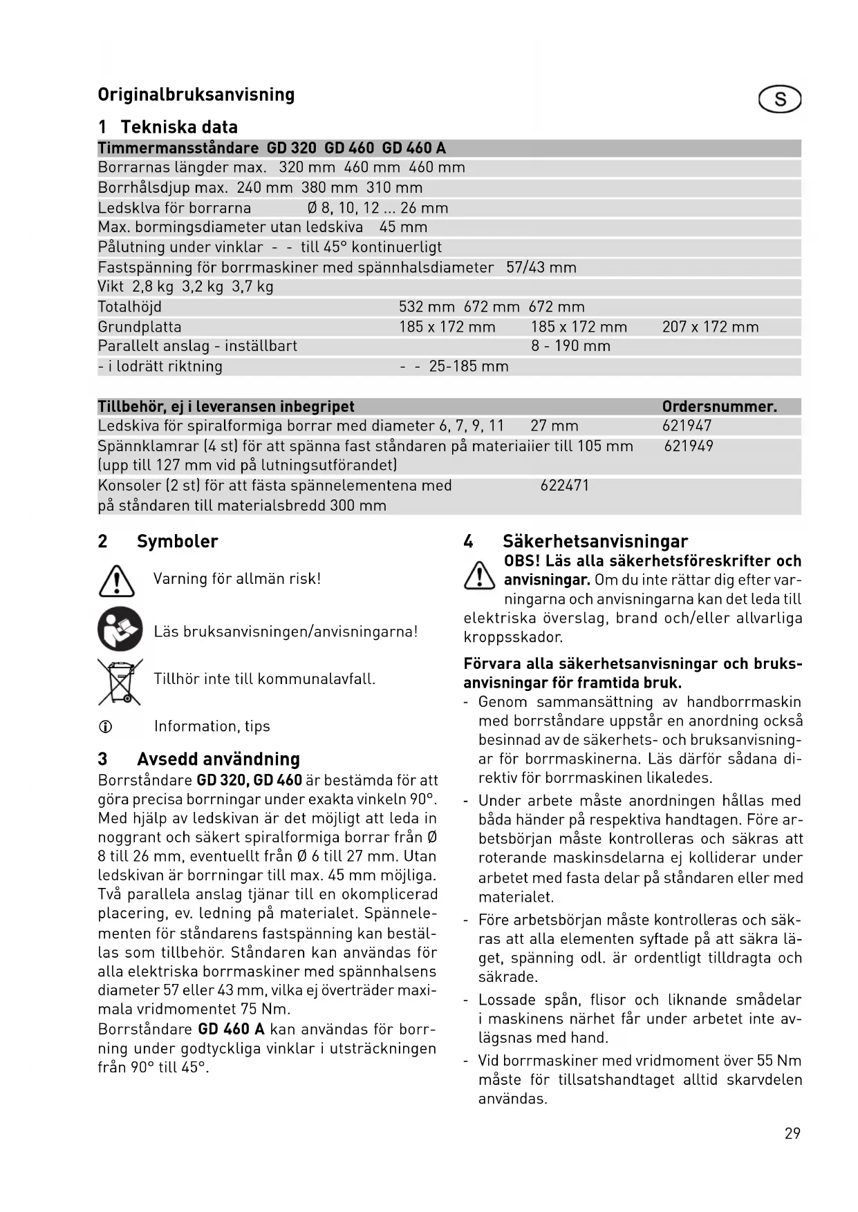 Alleen originele Festool-reserveonderde- len gebruiken! Bestelnr. op: www.festool.com/Service - Het stof, vuil en vijlsels van de spanelementen en de spanplaatsen verwijderen. - Het vuil van de leistangen met een waslap ver- wijderen, goede glijeigenschappen door het aanbrengen van het smeervet of de machine- olie op de leistangen verzekeren. - Aanzetoppervlakten van de basisplaat schoon houden, daardoor wordt de nauwkeurigheid van de hoeken van de openingen verzekerd. Volgende waarschuwin g i n ach t nemen : - De gekozen springveren van het boorgestel hebben geheel bewust een grotere afstand van de leistangen. Dat is geen gebrek aan de kwaliteit, integendeel, men bereikt daardoor een betere karakteristiek van de springve- ren. Deze sprinveren garanderen een kleinere weerstand bij het boren. 9 Speciale gevaaromschrijving voor het milieu Geef het apparaat niet met het huisvuil mee! Voer de apparaten, accessoires en verpakkingen op milieuvriendelijke wijze af! Neem de geldende nationale voorschriften in acht. Informatie voor REACh: www.festool.com/reach29 Originalbruksanvisning 1 Tekniska data Timmermansståndare GD 320 GD 460 GD 460 A Borrarnas längder max. 320 mm 460 mm 460 mm Borrhålsdjup max. 240 mm 380 mm 310 mm Ledsklva för borrarna Ø 8, 10, 12 ... 26 mm Max. bormingsdiameter utan ledskiva 45 mm Pålutning under vinklar - - till 45° kontinuerligt Fastspänning för borrmaskiner med spännhalsdiameter 57/43 mm Vikt 2,8 kg 3,2 kg 3,7 kg Totalhöjd 532 mm 672 mm 672 mm Grundplatta 185 x 172 mm 185 x 172 mm 207 x 172 mm Parallelt anslag - inställbart 8 - 190 mm - i lodrätt riktning - - 25-185 mm Tillbehör, ej i leveransen inbegripet Ordersnummer. Ledskiva för spiralformiga borrar med diameter 6, 7, 9, 11 27 mm 621947 Spännklamrar (4 st) för att spänna fast ståndaren på materiaiier till 105 mm 621949 (upp till 127 mm vid på lutningsutförandet) Konsoler (2 st) för att fästa spännelementena med 622471 på ståndaren till materialsbredd 300 mm 2 Symboler Varning för allmän risk! Läs bruksanvisningen/anvisningarna! Tillhör inte till kommunalavfall. Information, tips 3 Avsedd användning Borrståndare GD 320, GD 460 är bestämda för att göra precisa borrningar under exakta vinkeln 90°. Med hjälp av ledskivan är det möjligt att leda in noggrant och säkert spiralformiga borrar från Ø 8 till 26 mm, eventuellt från Ø 6 till 27 mm. Utan ledskivan är borrningar till max. 45 mm möjliga. Två parallela anslag tjänar till en okomplicerad placering, ev. ledning på materialet. Spännele- menten för ståndarens fastspänning kan bestäl- las som tillbehör. Ståndaren kan användas för alla elektriska borrmaskiner med spännhalsens diameter 57 eller 43 mm, vilka ej överträder maxi- mala vridmomentet 75 Nm. Borrståndare GD 460 A kan användas för borr- ning under godtyckliga vinklar i utsträckningen från 90° till 45°. 4 Säkerhetsanvisningar OBS! Läs alla säkerhetsföreskrifter och anvisningar. Om du inte rättar dig efter var- ningarna och anvisningarna kan det leda till elektriska överslag, brand och/eller allvarliga kroppsskador. Förvara alla säkerhetsanvisningar och bruks- anvisningar för framtida bruk. - Genom sammansättning av handborrmaskin med borrståndare uppstår en anordning också besinnad av de säkerhets- och bruksanvisning- ar för borrmaskinerna. Läs därför sådana di- rektiv för borrmaskinen likaledes. - Under arbete måste anordningen hållas med båda händer på respektiva handtagen. Före ar- betsbörjan måste kontrolleras och säkras att roterande maskinsdelarna ej kolliderar under arbetet med fasta delar på ståndaren eller med materialet. - Före arbetsbörjan måste kontrolleras och säk- ras att alla elementen syftade på att säkra lä- get, spänning odl. är ordentligt tilldragta och säkrade. - Lossade spån, fl isor och liknande smådelar i maskinens närhet får under arbetet inte av- lägsnas med hand. - Vid borrmaskiner med vridmoment över 55 Nm måste för tillsatshandtaget alltid skarvdelen användas.30 - Materialet måste alltid underläggas med ett fast underlägg och säkras mot vridning eller glidning. - Pålutbara borrståndare (GD 460 A) behöver vid hålborrning under vinkel säkras mot rubbning . För detta skälet rekommenderas att använda spännklamrar (tillbehör). - Under arbetet bevara din säkra och fasta ställ- ning. - För alla arbeten tjänande till beredning, monta- ge, omdaning, inställning, borrbyte, underhåll och behandling, stickkontakten till borrmaski- nen måste ha tagits ut ur vägguttaget. 5 Maskinens komponenter 1 Grundplatta 2 Parallelt ledstycke 3 Ledskiva för borrarna 4 Ledstänger 5 Fjädrar 6 Anslagsrör 7 Djupsanslagen 8 Ledbussning 9 Reduktion D 57/43 mm 10 Tillsatshandtag 11 Handtagsskarvdel 12 Spännklamrar 13 Konsoler 14 Lodrätt läge inställande skruv 15 Fötter 16 Spännmuttrar 17 Skala 18 Visare 19 Visares tilldragskruv 20 Bygel I bruksanvisningen avbildat och beskrivet tillbe- hör ingår inte alltid i leveransen. De angivna bilderna fi nns i början av bruksan- visningen. 6 Idriftstagande och användning