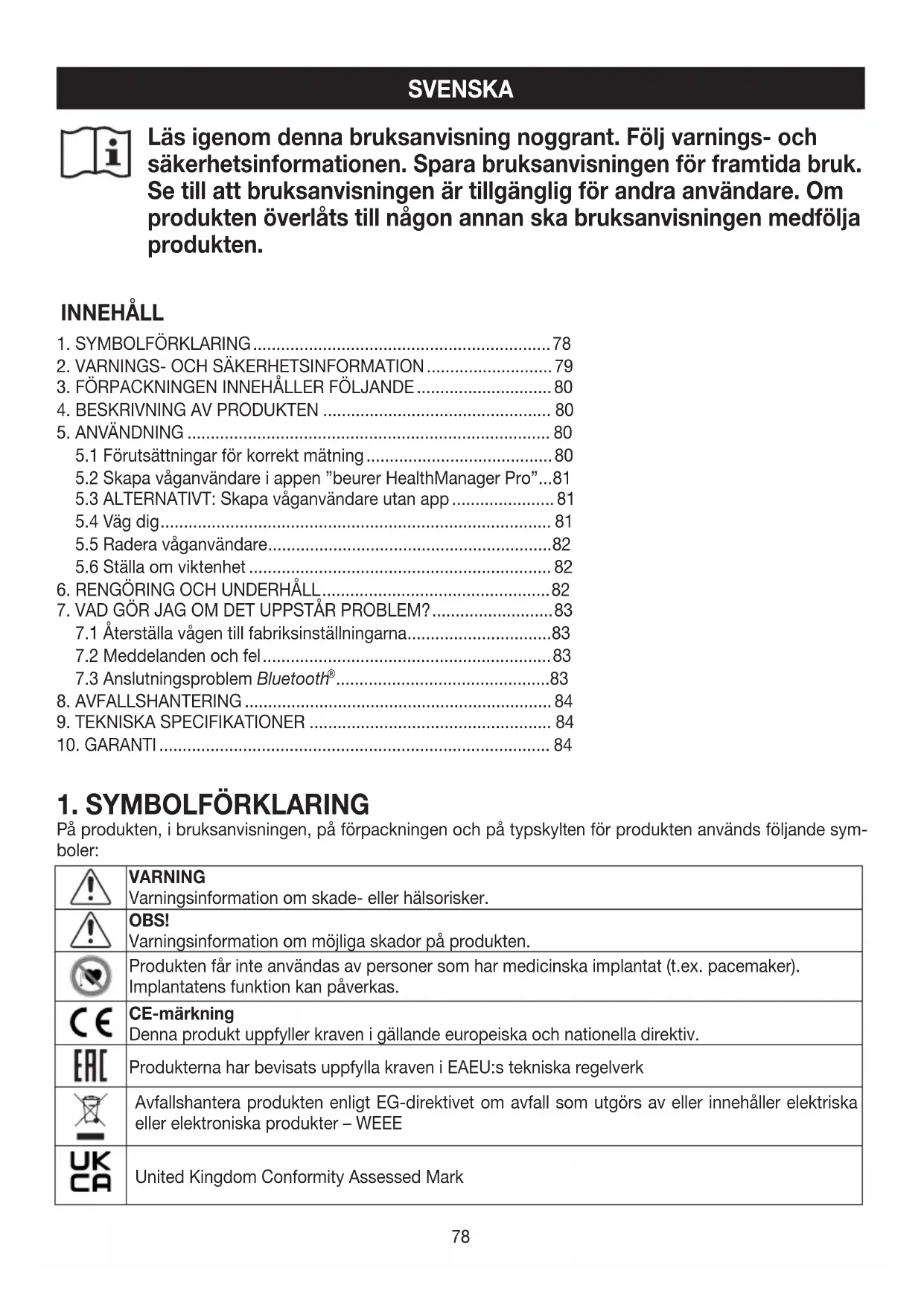 På produkten, i bruksanvisningen, på förpackningen och på typskylten för produkten används följande sym- boler: VARNING Varningsinformation om skade- eller hälsorisker. OBS! Varningsinformation om möjliga skador på produkten. Produkten får inte användas av personer som har medicinska implantat (t.ex. pacemaker). Implantatens funktion kan påverkas. CE-märkning Denna produkt uppfyller kraven i gällande europeiska och nationella direktiv. Produkterna har bevisats uppfylla kraven i EAEU:s tekniska regelverk Avfallshantera produkten enligt EG-direktivet om avfall som utgörs av eller innehåller elektriska eller elektroniska produkter – WEEE United Kingdom Conformity Assessed Mark79 Tillverkare