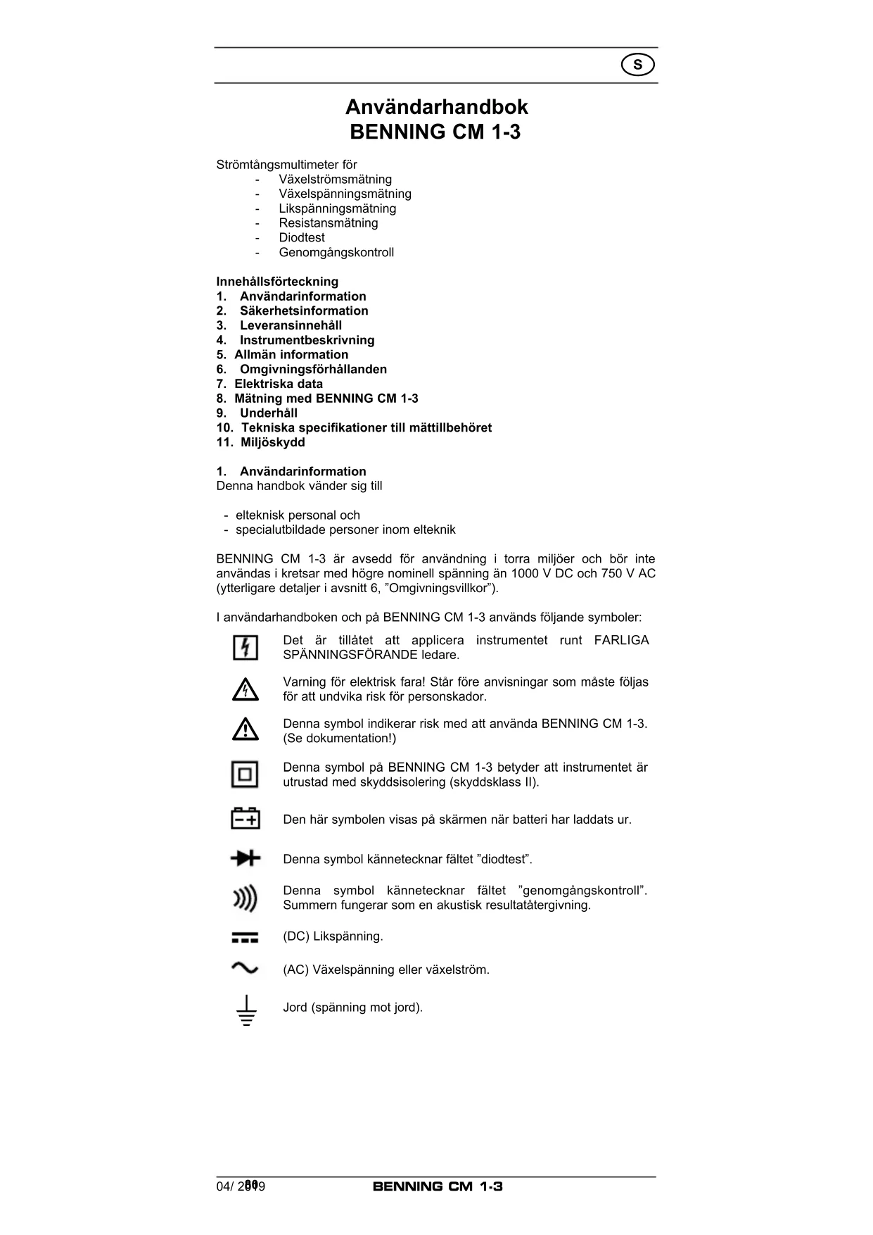 Denna handbok vänder sig till - elteknisk personal och - specialutbildade personer inom elteknik BENNING CM 1-3 är avsedd för användning i torra miljöer och bör inte användas i kretsar med högre nominell spänning än 1000 V DC och 750 V AC (ytterligare detaljer i avsnitt 6, ”Omgivningsvillkor”). I användarhandboken och på BENNING CM 1-3 används följande symboler: Det är tillåtet att applicera instrumentet runt FARLIGA SPÄNNINGSFÖRANDE ledare.