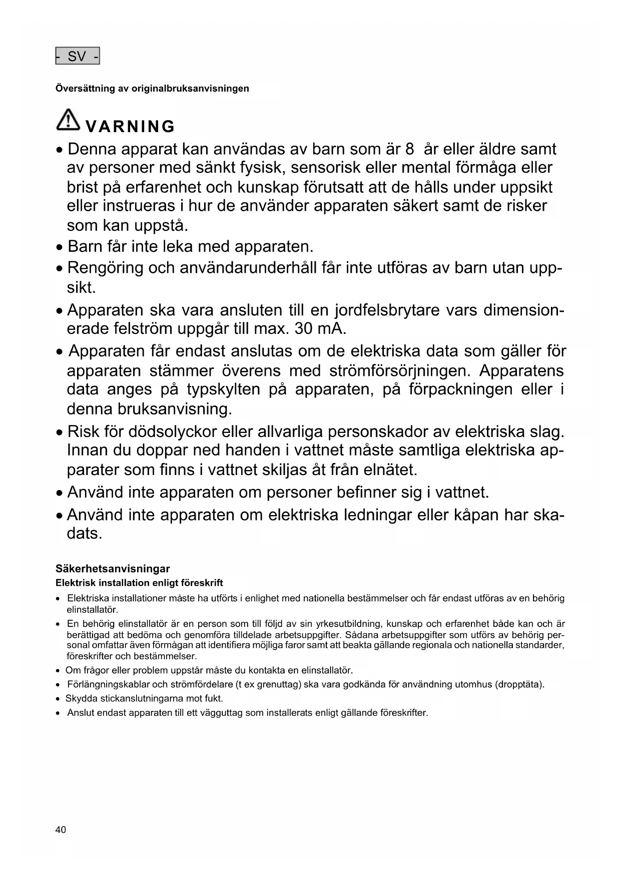 VARNING Denna apparat kan användas av barn som är 8 år eller äldre samt av personer med sänkt fysisk, sensorisk eller mental förmåga eller brist på erfarenhet och kunskap förutsatt att de hålls under uppsikt eller instrueras i hur de använder apparaten säkert samt de risker som kan uppstå. Barn får inte leka med apparaten. Rengöring och användarunderhåll får inte utföras av barn utan upp- sikt. Apparaten ska vara ansluten till en jordfelsbrytare vars dimension- erade felström uppgår till max. 30 mA. Apparaten får endast anslutas om de elektriska data som gäller för apparaten stämmer överens med strömförsörjningen. Apparatens data anges på typskylten på apparaten, på förpackningen eller i denna bruksanvisning. Risk för dödsolyckor eller allvarliga personskador av elektriska slag. Innan du doppar ned handen i vattnet måste samtliga elektriska ap- parater som finns i vattnet skiljas åt från elnätet. Använd inte apparaten om personer befinner sig i vattnet. Använd inte apparaten om elektriska ledningar eller kåpan har ska- dats.