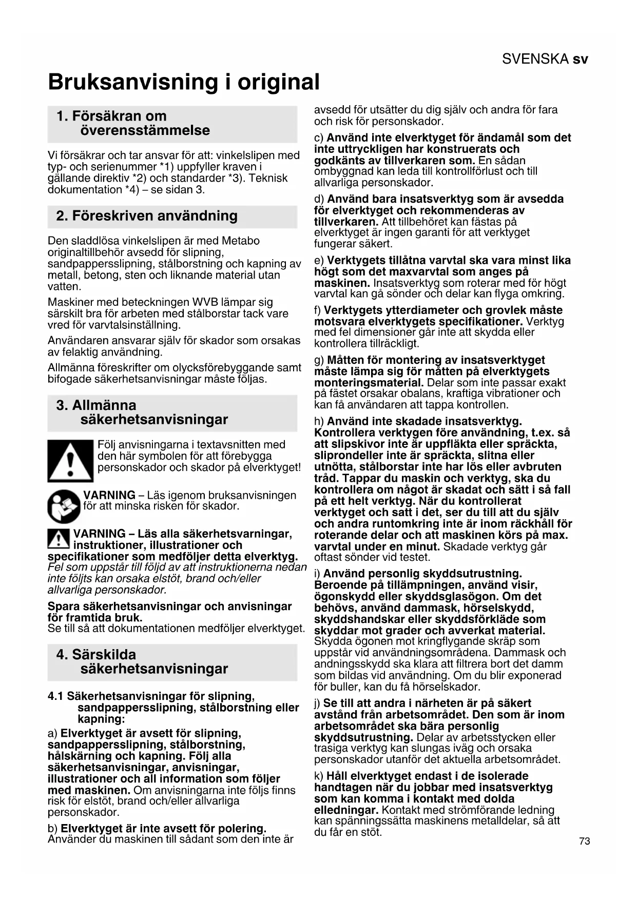 Bruksanvisning i original Vi försäkrar och tar ansvar för att: vinkelslipen med typ- och serienummer *1) uppfyller kraven i gällande direktiv *2) och standarder *3). Teknisk dokumentation *4) – se sidan 3. Den sladdlösa vinkelslipen är med Metabo originaltillbehör avsedd för slipning, sandpappersslipning, stålborstning och kapning av metall, betong, sten och liknande material utan vatten. Maskiner med beteckningen WVB lämpar sig särskilt bra för arbeten med stålborstar tack vare vred för varvtalsinställning. Användaren ansvarar själv för skador som orsakas av felaktig användning. Allmänna föreskrifter om olycksförebyggande samt bifogade säkerhetsanvisningar måste följas. Följ anvisningarna i textavsnitten med den här symbolen för att förebygga personskador och skador på elverktyget! VARNING – Läs igenom bruksanvisningen för att minska risken för skador. VARNING – Läs alla säkerhetsvarningar, instruktioner, illustrationer och specifikationer som medföljer detta elverktyg. Fel som uppstår till följd av att instruktionerna nedan inte följts kan orsaka elstöt, brand och/eller allvarliga personskador. Spara säkerhetsanvisningar och anvisningar för framtida bruk. Se till så att dokumentationen medföljer elverktyget.