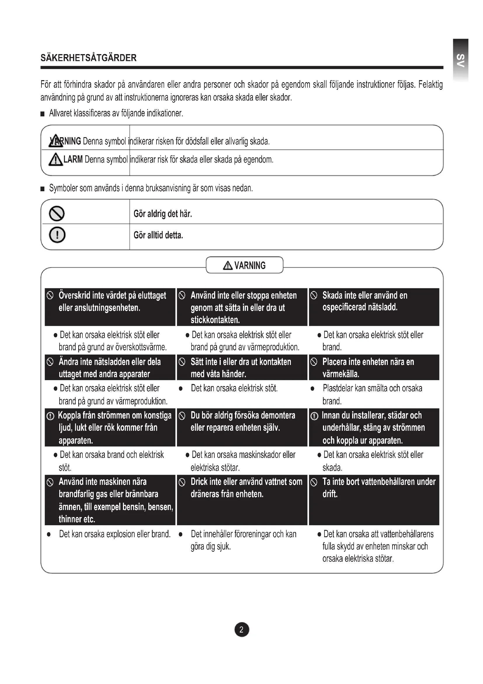 Ta inte bort vattenbehållaren under drift. ● Det kan orsaka explosion eller brand. ● Det innehåller föroreningar och kan göra dig sjuk. ● Det kan orsaka att vattenbehållarens fulla skydd av enheten minskar och orsaka elektriska stötar. VARNING SÄKERHETSÅTGÄRDERSÄKERHETSÅTGÄRDER SÄKERHETSÅTGÄRDER