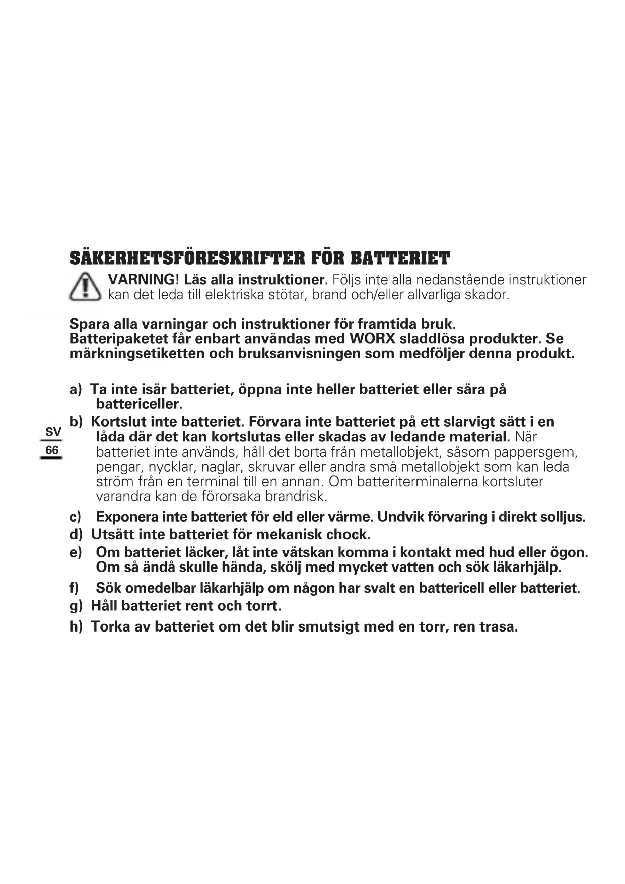 VARNING! Läs alla instruktioner. Följs inte alla nedanstående instruktioner kan det leda till elektriska stötar, brand och/eller allvarliga skador. Spara alla varningar och instruktioner för framtida bruk. Batteripaketet får enbart användas med WORX sladdlösa produkter. Se märkningsetiketten och bruksanvisningen som medföljer denna produkt. a) Ta inte isär batteriet, öppna inte heller batteriet eller sära på battericeller. b) Kortslut inte batteriet. Förvara inte batteriet på ett slarvigt sätt i en låda där det kan kortslutas eller skadas av ledande material. När batteriet inte används, håll det borta från metallobjekt, såsom pappersgem, pengar, nycklar, naglar, skruvar eller andra små metallobjekt som kan leda ström från en terminal till en annan. Om batteriterminalerna kortsluter varandra kan de förorsaka brandrisk.