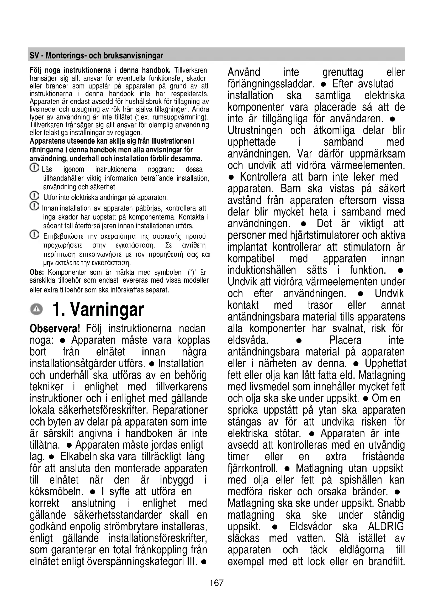 Στην περίπτωση που η βλάβη παραμένει -μετά τη διενέργεια των παραπάνω ελέγχων- επικοινωνήστε με το πλησιέστερο Τμήμα Τεχνικής Υποστήριξης.167 SV - Monterings- och bruksanvisningar Följ noga instruktionerna i denna handbok. Tillverkaren frånsäger sig allt ansvar för eventuella funktionsfel, skador eller bränder som uppstår på apparaten på grund av att instruktionerna i denna handbok inte har respekterats. Apparaten är endast avsedd för hushållsbruk för tillagning av livsmedel och utsugning av rök från själva tillagningen. Andra typer av användning är inte tillåtet (t.ex. rumsuppvärmning). Tillverkaren frånsäger sig allt ansvar för olämplig användning eller felaktiga inställningar av reglagen. Apparatens utseende kan skilja sig från illustrationen i ritningarna i denna handbok men alla anvisningar för användning, underhåll och installation förblir desamma. Läs igenom instruktionerna noggrant: dessa tillhandahåller viktig information beträffande installation, användning och säkerhet. Utför inte elektriska ändringar på apparaten. Innan installation av apparaten påbörjas, kontrollera att inga skador har uppstått på komponenterna. Kontakta i sådant fall återförsäljaren innan installationen utförs. Επιβεβαιώστε την ακεραιότητα της συσκευής προτού προχωρήσετε στην εγκατάσταση. Σε αντίθετη περίπτωση επικοινωνήστε με τον προμηθευτή σας και μην εκτελείτε την εγκατάσταση. Obs: Komponenter som är märkta med symbolen "(*)" är särskilda tillbehör som endast levereras med vissa modeller eller extra tillbehör som ska införskaffas separat.