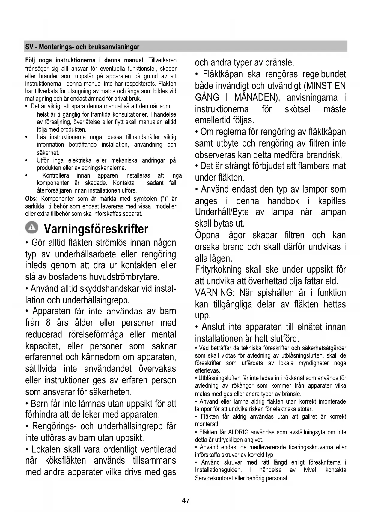 Επανατοποθετήστε τα φίλτρα λίπους. Σε περίπτωση που ο φωτισμός δεν λειτουργήσει, ελέγξτε για την σωστή τοποθέτηση των λαμπών στις θήκες τους πριν καλέσετε την τεχνική βοήθεια.47 SV - Monterings- och bruksanvisningar Följ noga instruktionerna i denna manual. Tillverkaren frånsäger sig allt ansvar för eventuella funktionsfel, skador eller bränder som uppstår på apparaten på grund av att instruktionerna i denna manual inte har respekterats. Fläkten har tillverkats för utsugning av matos och ånga som bildas vid matlagning och är endast ämnad för privat bruk.