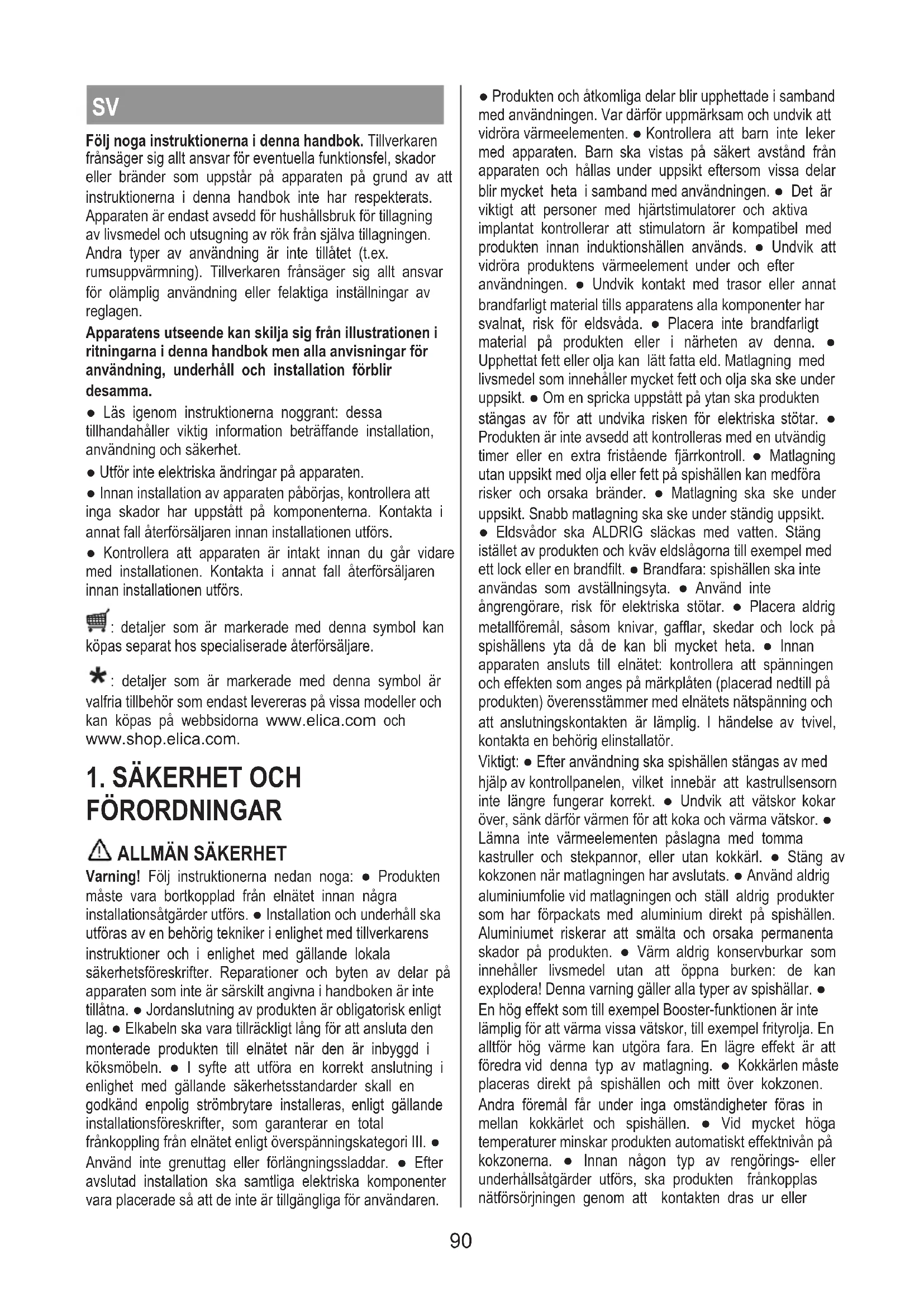 Στην περίπτωση που η βλάβη παραμένει -μετά τη διενέργεια των παραπάνω ελέγχων- επικοινωνήστε με το πλη- σιέστερο Τμήμα Τεχνικής Υποστήριξης. 89SV Följ noga instruktionerna i denna handbok. Tillverkaren frånsäger sig allt ansvar för eventuella funktionsfel, skador eller bränder som uppstår på apparaten på grund av att instruktionerna i denna handbok inte har respekterats. Apparaten är endast avsedd för hushållsbruk för tillagning av livsmedel och utsugning av rök från själva tillagningen. Andra typer av användning är inte tillåtet (t.ex. rumsuppvärmning). Tillverkaren frånsäger sig allt ansvar för olämplig användning eller felaktiga inställningar av reglagen. Apparatens utseende kan skilja sig från illustrationen i ritningarna i denna handbok men alla anvisningar för användning, underhåll och installation förblir desamma. ● Läs igenom instruktionerna noggrant: dessa tillhandahåller viktig information beträffande installation, användning och säkerhet. ● Utför inte elektriska ändringar på apparaten. ● Innan installation av apparaten påbörjas, kontrollera att inga skador har uppstått på komponenterna. Kontakta i annat fall återförsäljaren innan installationen utförs. ● Kontrollera att apparaten är intakt innan du går vidare med installationen. Kontakta i annat fall återförsäljaren innan installationen utförs. : detaljer som är markerade med denna symbol kan köpas separat hos specialiserade återförsäljare. : detaljer som är markerade med denna symbol är valfria tillbehör som endast levereras på vissa modeller och kan köpas på webbsidorna www.elica.com och www.shop.elica.com.