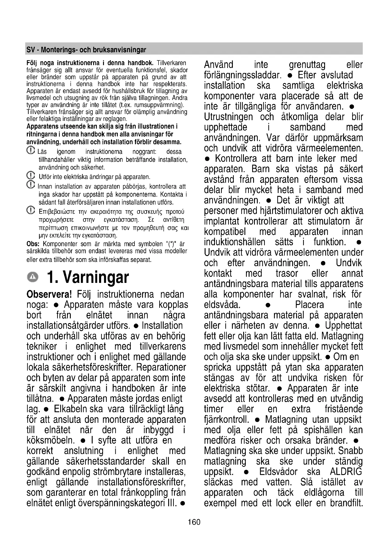 Στην περίπτωση που η βλάβη παραμένει -μετά τη διενέργεια των παραπάνω ελέγχων- επικοινωνήστε με το πλησιέστερο Τμήμα Τεχνικής Υποστήριξης.160 SV - Monterings- och bruksanvisningar Följ noga instruktionerna i denna handbok. Tillverkaren frånsäger sig allt ansvar för eventuella funktionsfel, skador eller bränder som uppstår på apparaten på grund av att instruktionerna i denna handbok inte har respekterats. Apparaten är endast avsedd för hushållsbruk för tillagning av livsmedel och utsugning av rök från själva tillagningen. Andra typer av användning är inte tillåtet (t.ex. rumsuppvärmning). Tillverkaren frånsäger sig allt ansvar för olämplig användning eller felaktiga inställningar av reglagen. Apparatens utseende kan skilja sig från illustrationen i ritningarna i denna handbok men alla anvisningar för användning, underhåll och installation förblir desamma. Läs igenom instruktionerna noggrant: dessa tillhandahåller viktig information beträffande installation, användning och säkerhet. Utför inte elektriska ändringar på apparaten. Innan installation av apparaten påbörjas, kontrollera att inga skador har uppstått på komponenterna. Kontakta i sådant fall återförsäljaren innan installationen utförs. Επιβεβαιώστε την ακεραιότητα της συσκευής προτού προχωρήσετε στην εγκατάσταση. Σε αντίθετη περίπτωση επικοινωνήστε με τον προμηθευτή σας και μην εκτελείτε την εγκατάσταση. Obs: Komponenter som är märkta med symbolen "(*)" är särskilda tillbehör som endast levereras med vissa modeller eller extra tillbehör som ska införskaffas separat.