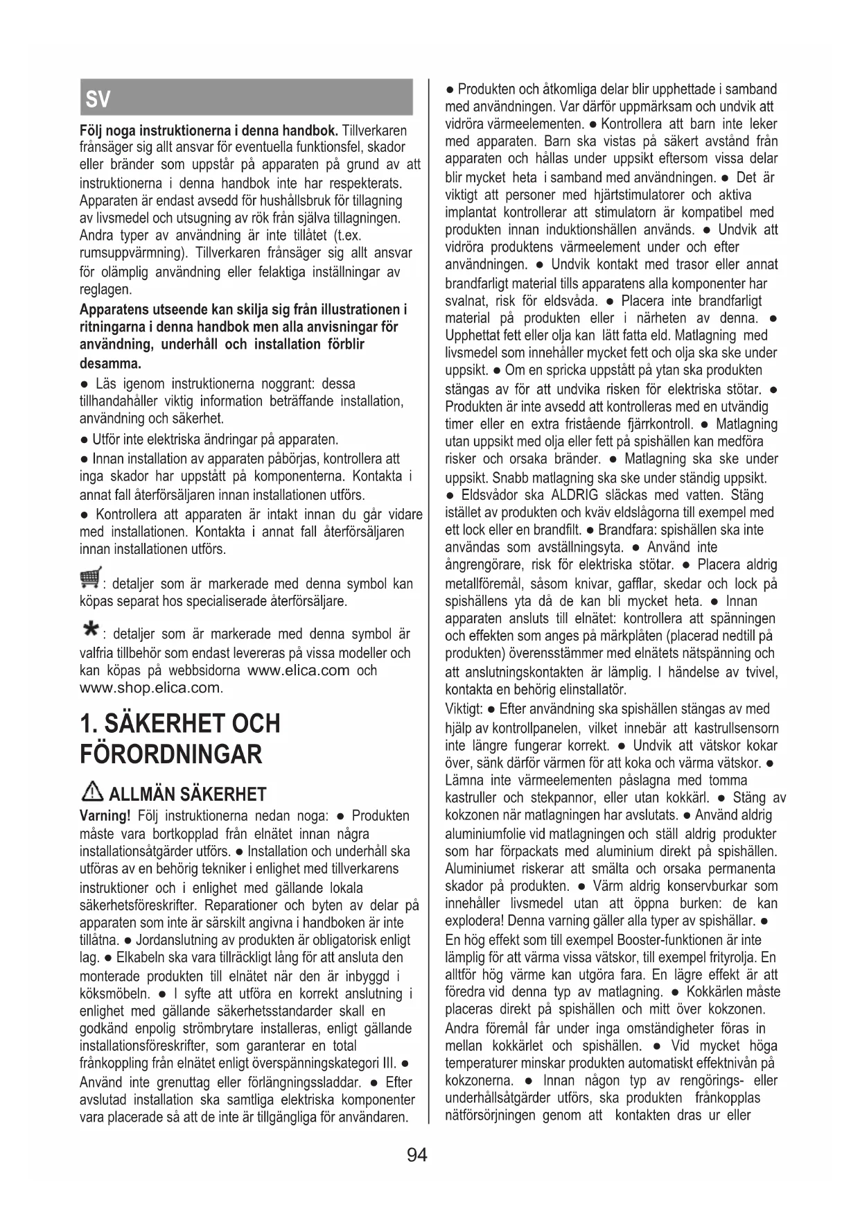 Στην περίπτωση που η βλάβη παραμένει -μετά τη διενέργεια των παραπάνω ελέγχων- επικοινωνήστε με το πλησιέστερο Τμήμα Τεχνικής Υποστήριξης. 93SV Följ noga instruktionerna i denna handbok. Tillverkaren frånsäger sig allt ansvar för eventuella funktionsfel, skador eller bränder som uppstår på apparaten på grund av att instruktionerna i denna handbok inte har respekterats. Apparaten är endast avsedd för hushållsbruk för tillagning av livsmedel och utsugning av rök från själva tillagningen. Andra typer av användning är inte tillåtet (t.ex. rumsuppvärmning). Tillverkaren frånsäger sig allt ansvar för olämplig användning eller felaktiga inställningar av reglagen. Apparatens utseende kan skilja sig från illustrationen i ritningarna i denna handbok men alla anvisningar för användning, underhåll och installation förblir desamma. ● Läs igenom instruktionerna noggrant: dessa tillhandahåller viktig information beträffande installation, användning och säkerhet. ● Utför inte elektriska ändringar på apparaten. ● Innan installation av apparaten påbörjas, kontrollera att inga skador har uppstått på komponenterna. Kontakta i annat fall återförsäljaren innan installationen utförs. ● Kontrollera att apparaten är intakt innan du går vidare med installationen. Kontakta i annat fall återförsäljaren innan installationen utförs. : detaljer som är markerade med denna symbol kan köpas separat hos specialiserade återförsäljare. : detaljer som är markerade med denna symbol är valfria tillbehör som endast levereras på vissa modeller och kan köpas på webbsidorna www.elica.com och www.shop.elica.com.