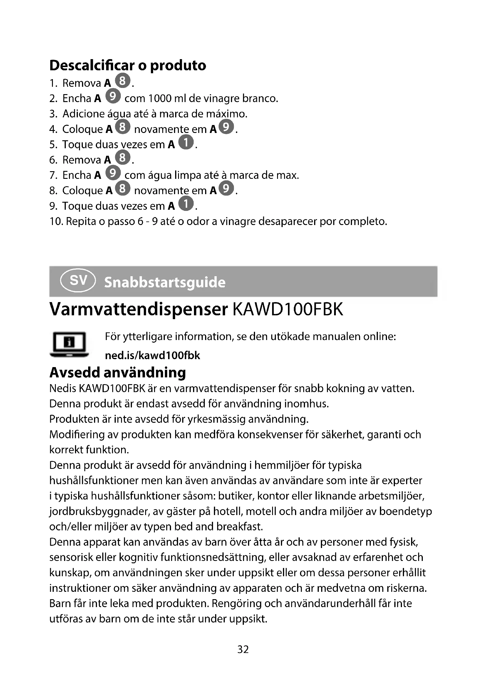 Snabbstartsguide Varmvattendispenser KAWD100FBK För ytterligare information, se den utökade manualen online: ned.is/kawd100fbk Avsedd användning Nedis KAWD100FBK är en varmvattendispenser för snabb kokning av vatten. Denna produkt är endast avsedd för användning inomhus. Produkten är inte avsedd för yrkesmässig användning. Modiering av produkten kan medföra konsekvenser för säkerhet, garanti och korrekt funktion. Denna produkt är avsedd för användning i hemmiljöer för typiska hushållsfunktioner men kan även användas av användare som inte är experter i typiska hushållsfunktioner såsom: butiker, kontor eller liknande arbetsmiljöer, jordbruksbyggnader, av gäster på hotell, motell och andra miljöer av boendetyp och/eller miljöer av typen bed and breakfast. Denna apparat kan användas av barn över åtta år och av personer med fysisk, sensorisk eller kognitiv funktionsnedsättning, eller avsaknad av erfarenhet och kunskap, om användningen sker under uppsikt eller om dessa personer erhållit instruktioner om säker användning av apparaten och är medvetna om riskerna. Barn får inte leka med produkten. Rengöring och användarunderhåll får inte utföras av barn om de inte står under uppsikt. KAWD100FBK_MAN_COMP_0520_print_(20161 1422)_v00.01.indd 32KAWD100FBK_MAN_COMP_0520_print_(20161 1422)_v00.01.indd 32 18-05-2020 09:0818-05-2020 09:0833 Specikationer Produkt Varmvattendispenser Artikelnummer KAWD100FBK Dimensioner (l x b x h) 240 x 140 x 300 mm Vikt 1595 g Strömförsörjning 220 - 240 VAC / 50/60 Hz Strömförbrukning 2200 - 2600 W Eektförbrukning i vänteläge 0,5 W Vattenmängd 0,5 - 2,5 L Huvuddelar (bild A)