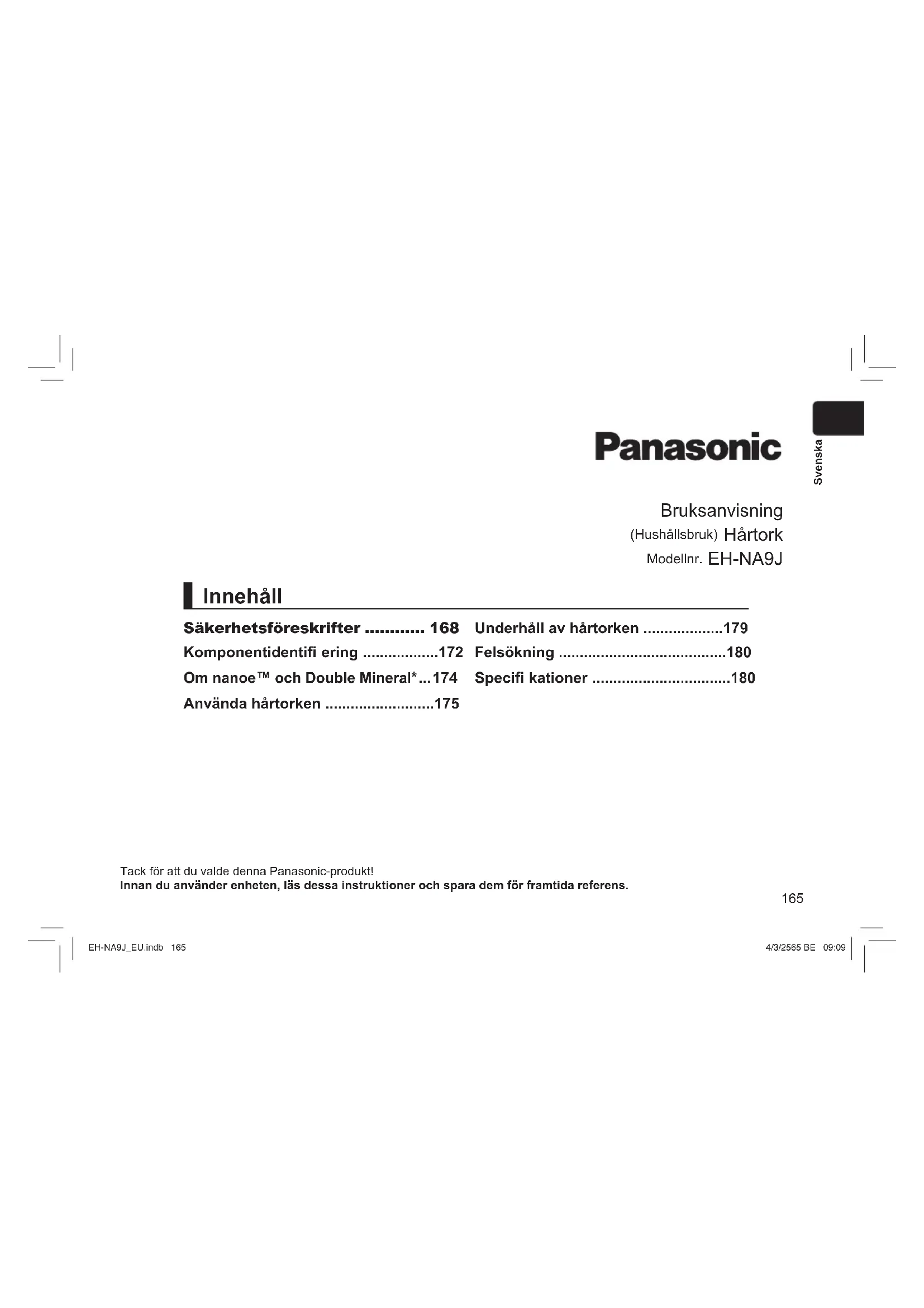 - Lämna inte apparaten med kvarvarande hårvårdsprodukter eller kosmetika på den. Det kommer att leda till försämring av plasten, missfärgning och sprickor. alcoholpolish remover EH-NA9J_EU.indb 179EH-NA9J_EU.indb 179 4/3/2565 BE 09:094/3/2565 BE 09:09180 Svenska Felsökning Problem Möjlig orsak Åtgärd Gnistor kan ses inuti apparaten när du använder [HOT]. (Dessa gnistor orsakas av termostatbrytaren som är en skyddsanordning och är inte farliga). Det sitter damm på luftintaget eller luftutblåset. Hår eller något annat blockerar luftintaget. Ta bort det ansamlade dammet. (Se sidan 179.) Varm luft växlar upprepade gånger till kall luft. Blockera inte luftintaget. Den varma luften är onormalt het. Kontakten är onormalt het. Kontakten sitter inte ordentligt i eluttaget. Använd ett eluttag där kontakten passar ordentligt. Gnistor genereras inuti nanoe™-utblåset. Den nålformade delen på baksidan av nanoe™-utblåset är smutsig. Utför underhåll på nanoe™- utblåset. (Se sidan 179.) Ett oljud (knaster) hörs inuti nanoe™-utblåset. En konstig lukt känns. Detta beror på att nanoe™ och mineraljon producerar en egenartad lukt. Det är inget som påverkar kroppen. Små vattendroppar fl yger ut från nanoe™- utblåset. Vattendroppar kan då och då stänka ut från utloppet av nanoe™ vid generering av nanoe™, och det betraktas inte som något onormalt. [HOT]-lampan blinkar snabbt (två gånger per sekund). Det är fel på apparaten. Kontakta ett auktoriserat servicecenter för reparation. Om problemen fortfarande inte kan lösas, kontakta den butik där du köpte apparaten eller ett servicecenter som auktoriserats av Panasonic för reparation. Specifi kationer Produktmodell EH-NA9J Strömförsörjning 220 V