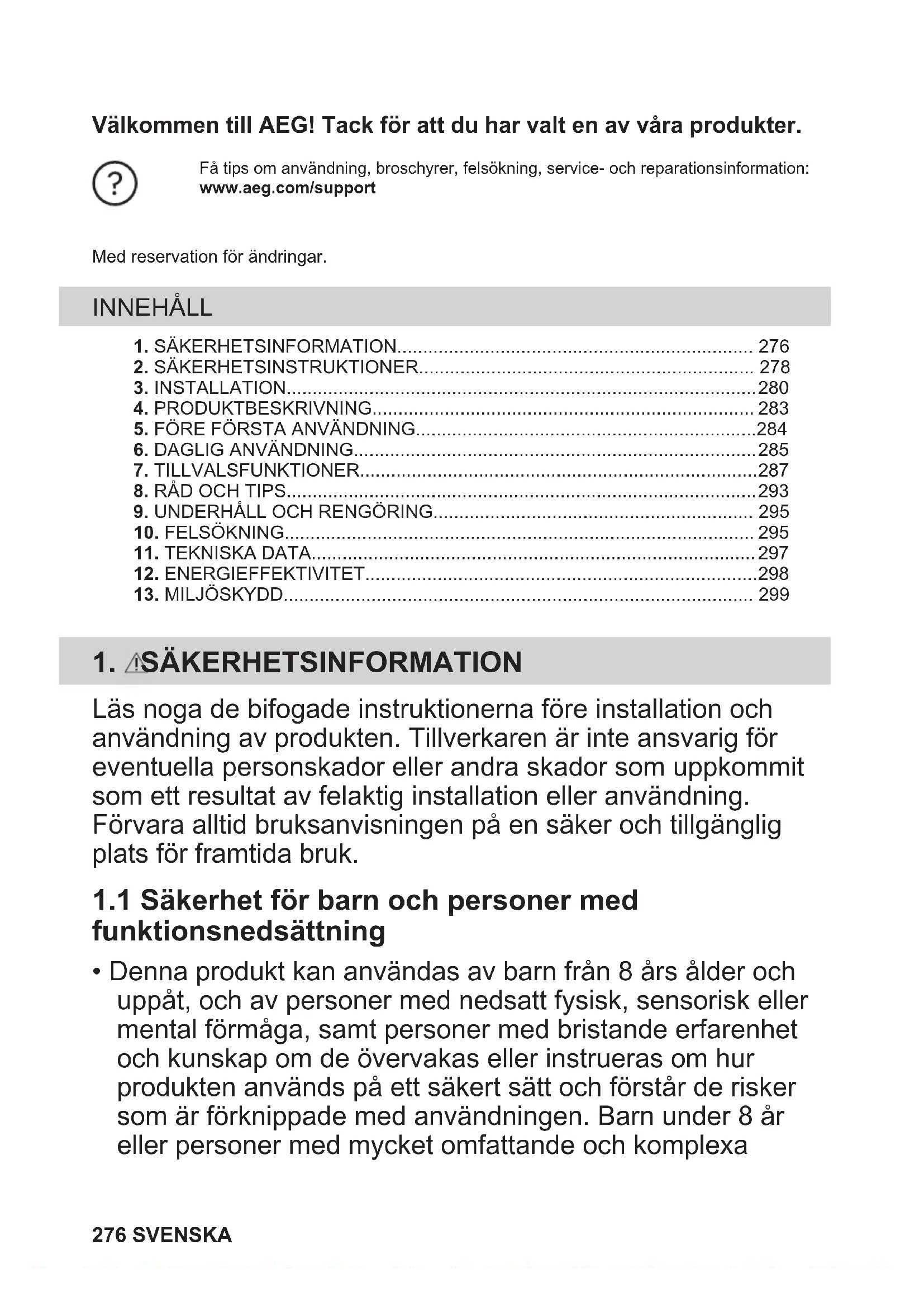 - Denna produkt kan användas av barn från 8 års ålder och uppåt, och av personer med nedsatt fysisk, sensorisk eller mental förmåga, samt personer med bristande erfarenhet och kunskap om de övervakas eller instrueras om hur produkten används på ett säkert sätt och förstår de risker som är förknippade med användningen. Barn under 8 år eller personer med mycket omfattande och komplexa 276 SVENSKAfunktionsnedsättningar ska inte vistas i närheten av produkten utan ständig uppsikt.